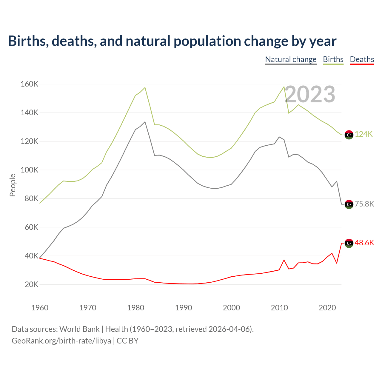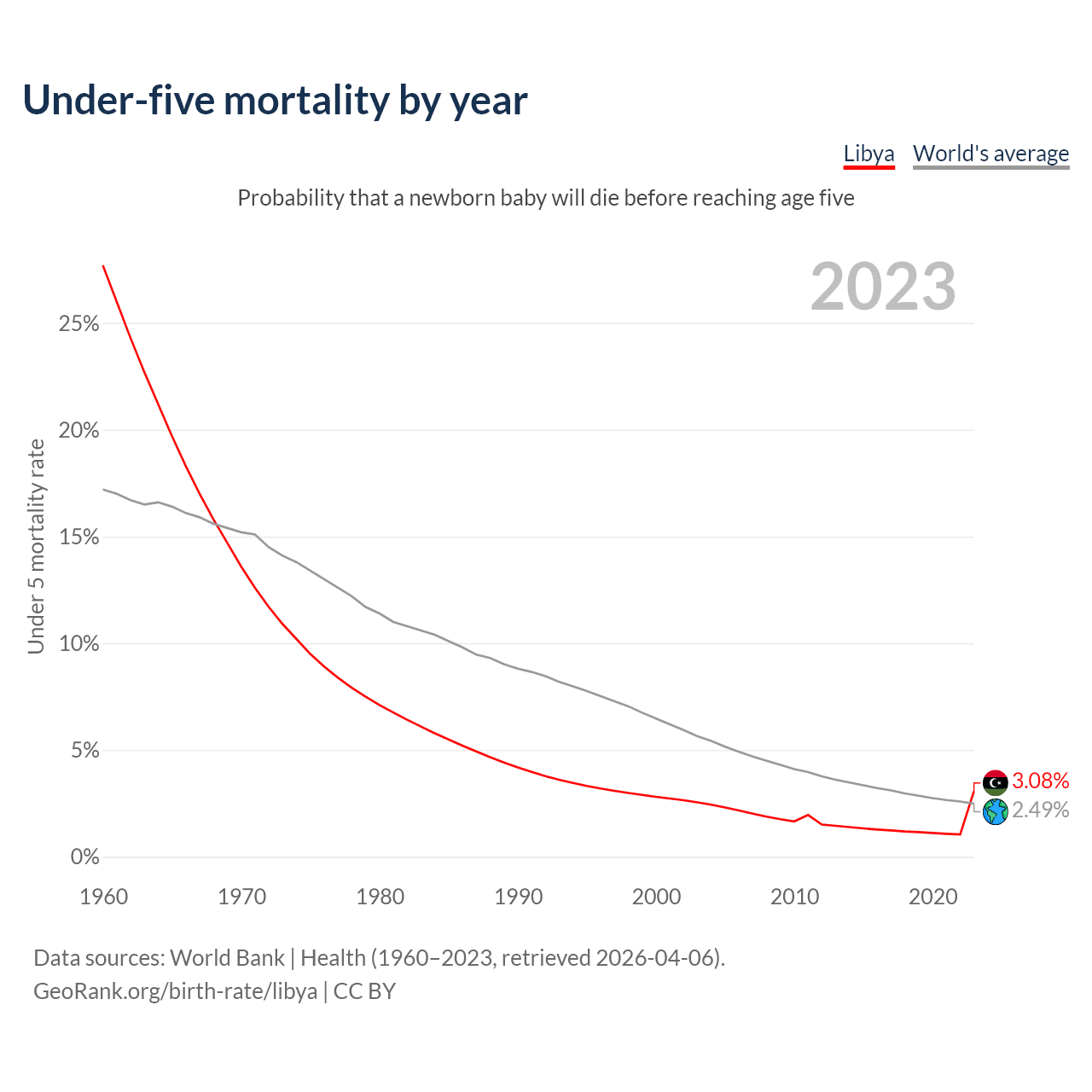 The under-5 mortality rate in Libya was 30.8 deaths per 1,000 live births in 2023 — a 3.08% chance that a newborn baby will die before reaching age five. This is up from 28.1 deaths per 1,000 live births in 2000.