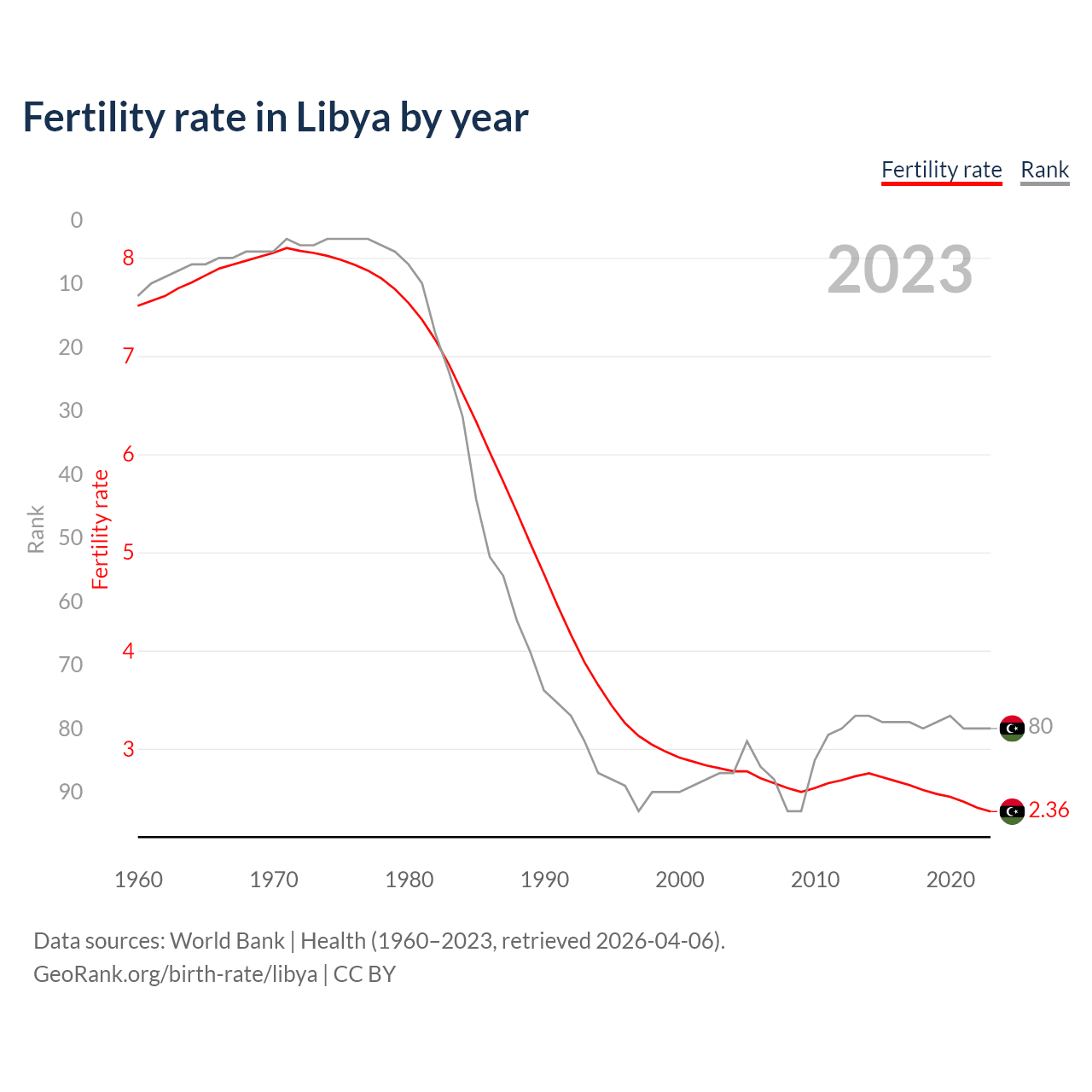 In 1960, the fertility rate in Libya was 7.51 children per woman — 3.19 times higher than in 2023.