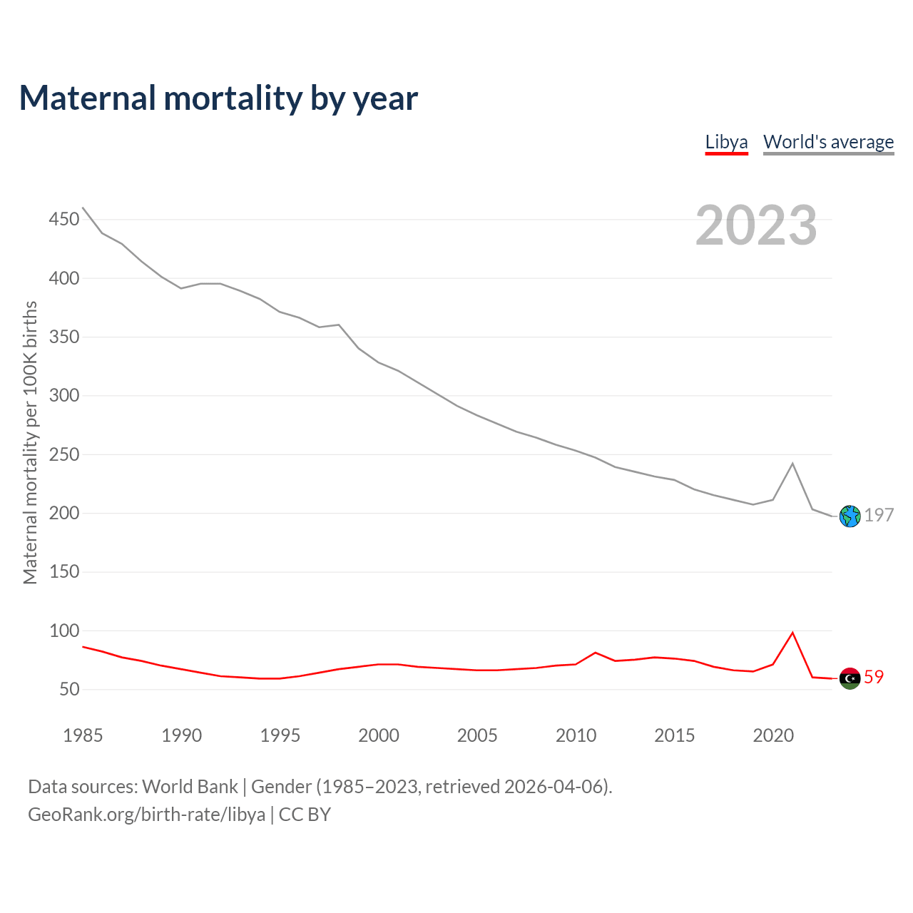 The maternal mortality rate in Libya was 59 deaths per 100,000 live births in 2023 — a 0.06% chance of dying during childbirth or within 42 days of pregnancy termination. This is a 16.9% decrease compared to the year 2000.