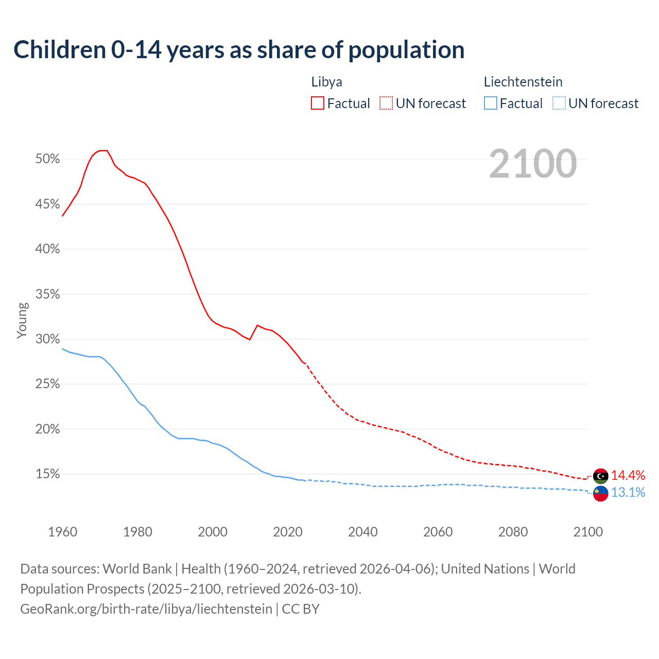 Children aged 0-14 make up 27.4% of the population in Libya and 14.3% in Liechtenstein in 2024, compared to 41.7% and 19.1% respectively in 1990.