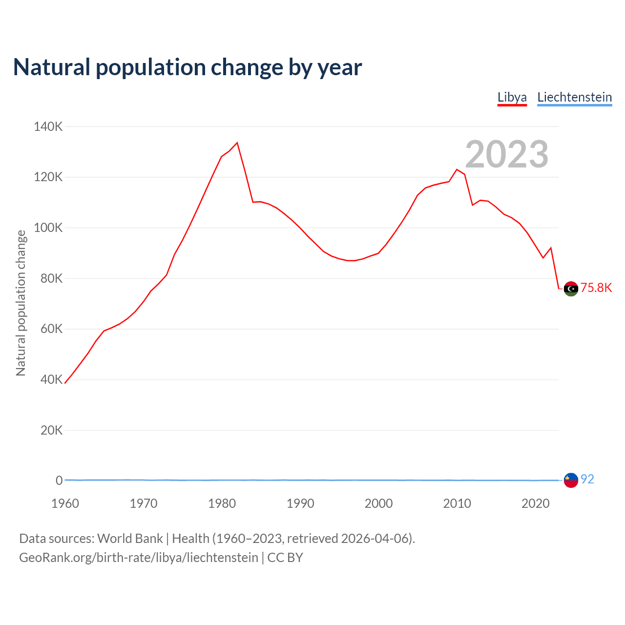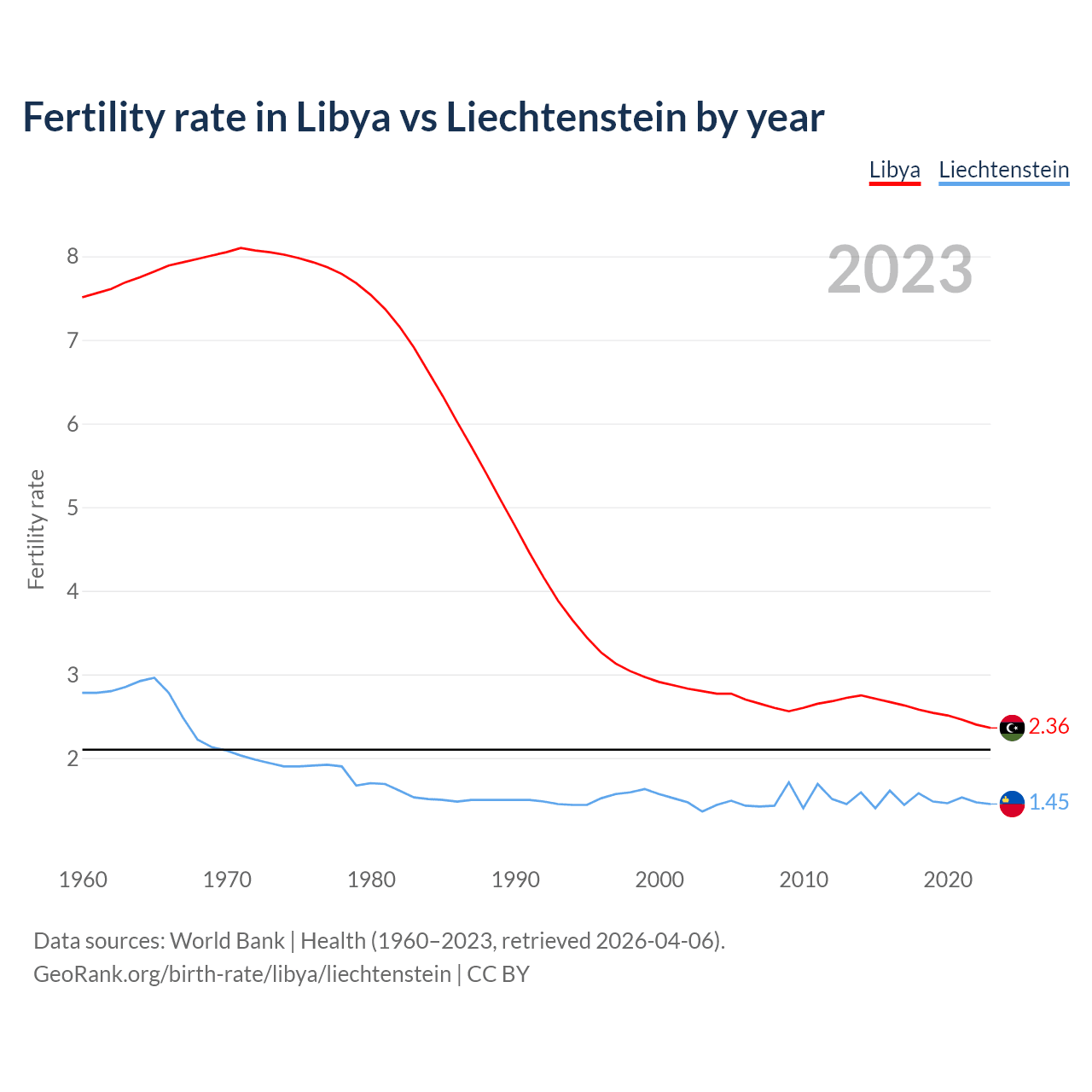 According to the latest available data on birth rates, the fertility rate in Libya was 2.36 children per woman in 2023, compared to 1.45 in Liechtenstein in 2023. The replacement level is considered to be 2.1 children per woman.