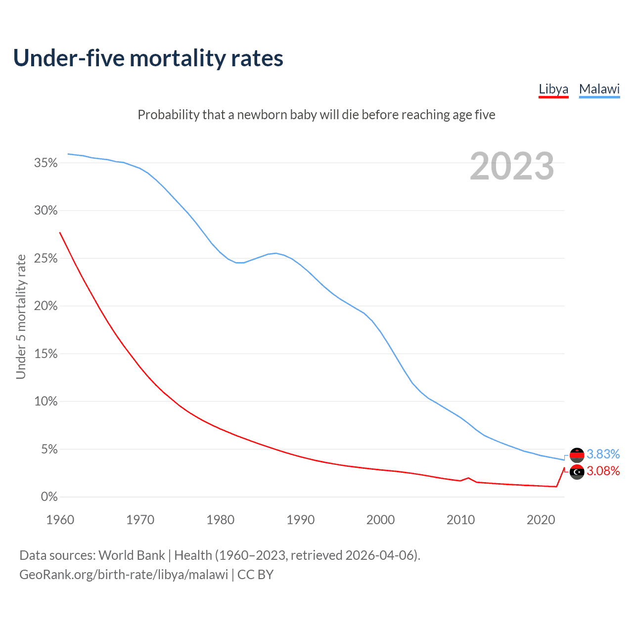 The chance that a newborn baby will die before reaching age five is 3.08% in Libya and 3.83% in Malawi. Above is a chart with historical data on under-five mortality rates.