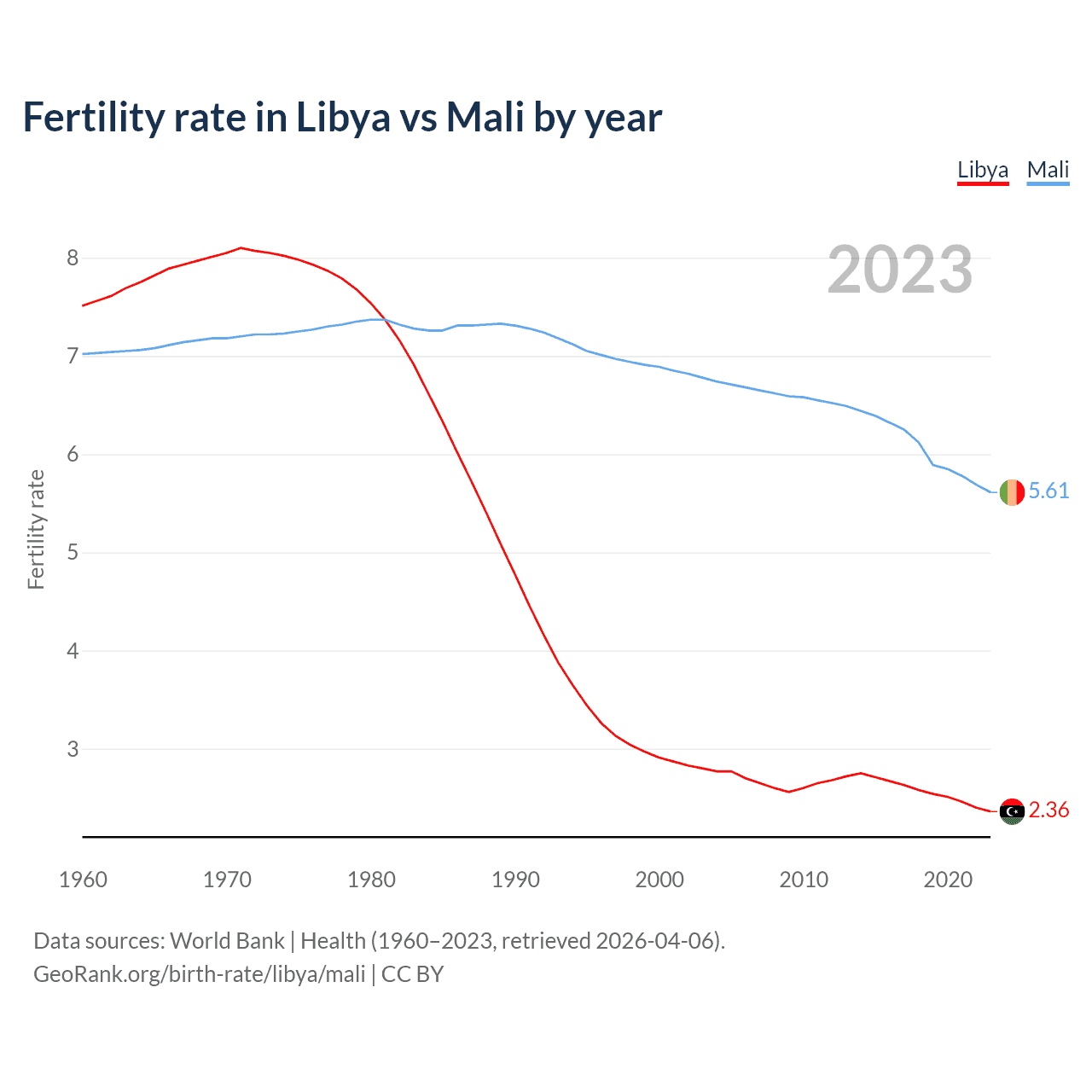 1960 vs 2023, the fertility rate has decreased by 68.6% in Libya and by 20% in Mali — in 1960, it was 7.51 and 7.02, respectively.