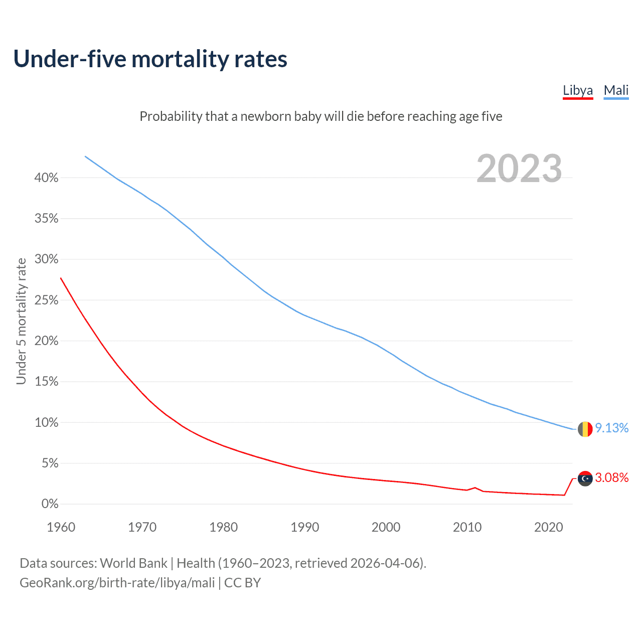 The chance that a newborn baby will die before reaching age five is 3.08% in Libya and 9.13% in Mali. Above is a chart with historical data on under-five mortality rates.