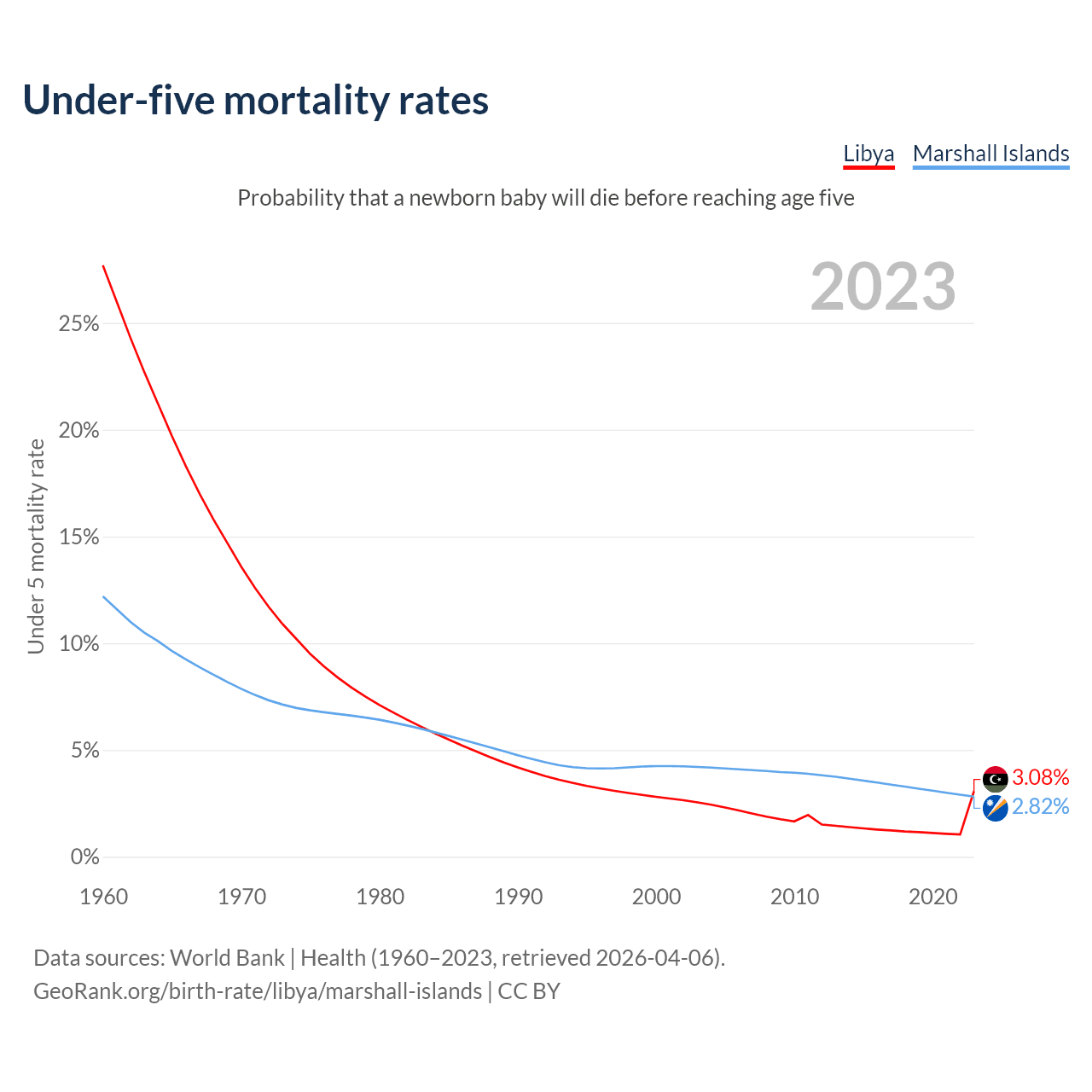 The chance that a newborn baby will die before reaching age five is 3.08% in Libya and 2.82% in the Marshall Islands. Above is a chart with historical data on under-five mortality rates.