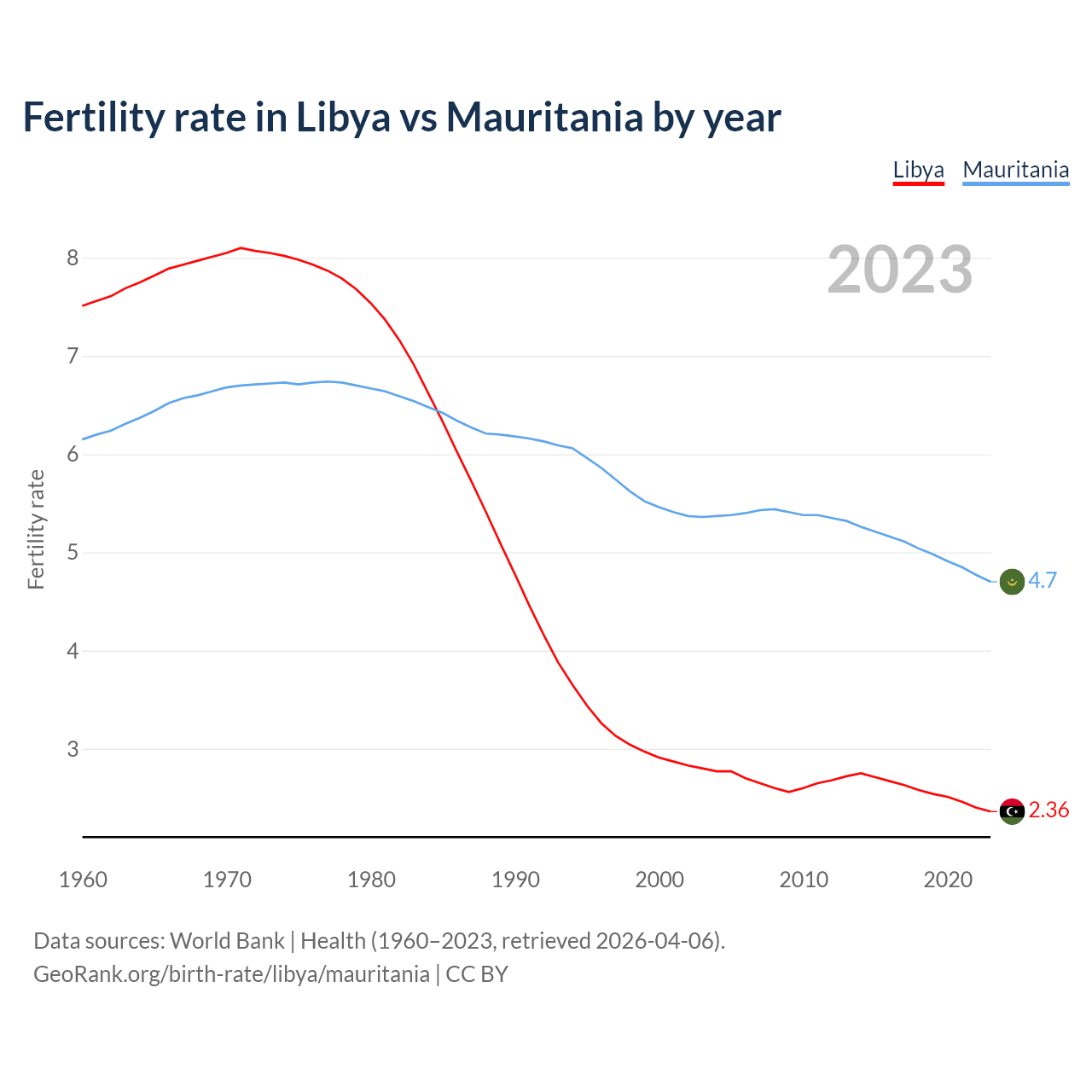 1960 vs 2023, the fertility rate has decreased by 68.6% in Libya and by 23.6% in Mauritania — in 1960, it was 7.51 and 6.15, respectively.