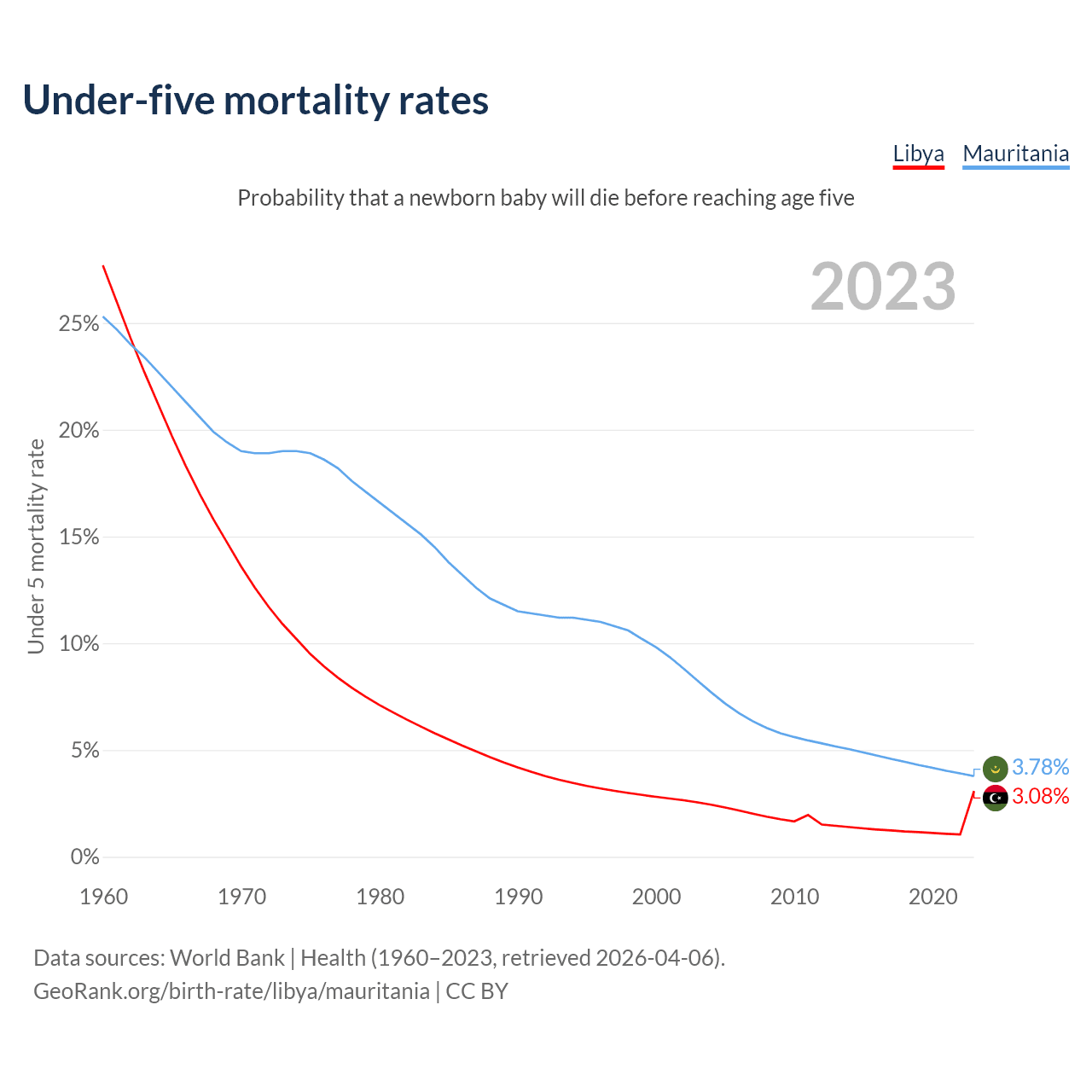 The chance that a newborn baby will die before reaching age five is 3.08% in Libya and 3.78% in Mauritania. Above is a chart with historical data on under-five mortality rates.