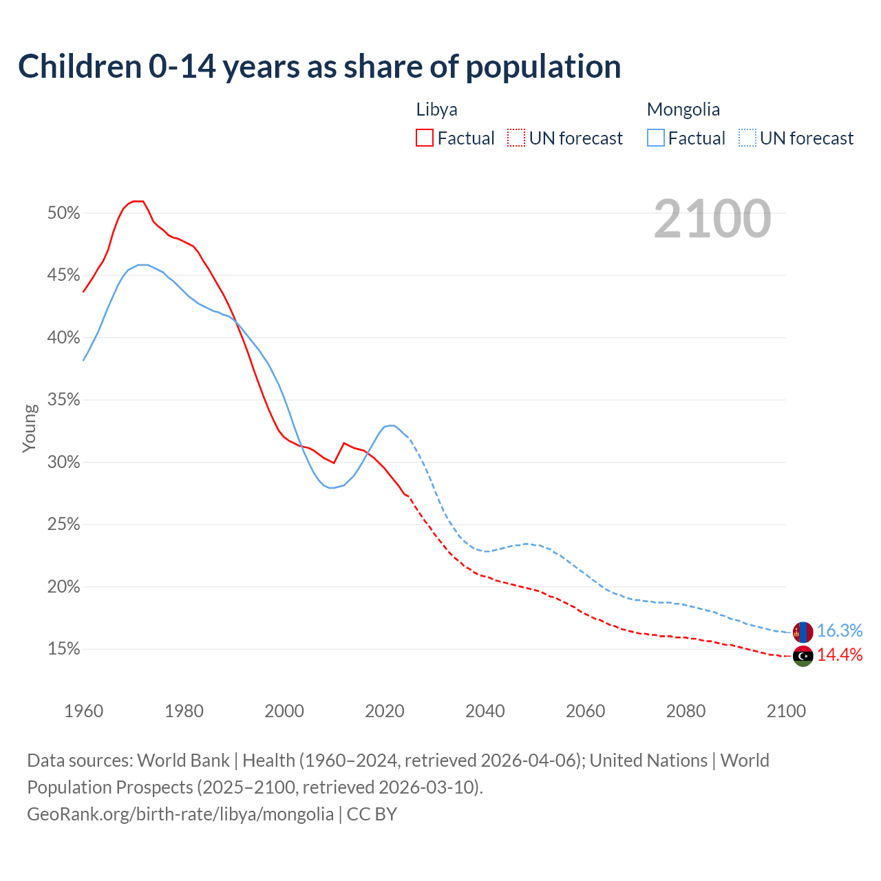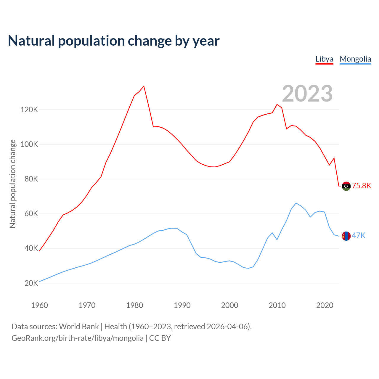 According to the latest available data on birth rates, the fertility rate in Libya was 2.36 children per woman in 2023, compared to 2.7 in Mongolia in 2023. The replacement level is considered to be 2.1 children per woman.