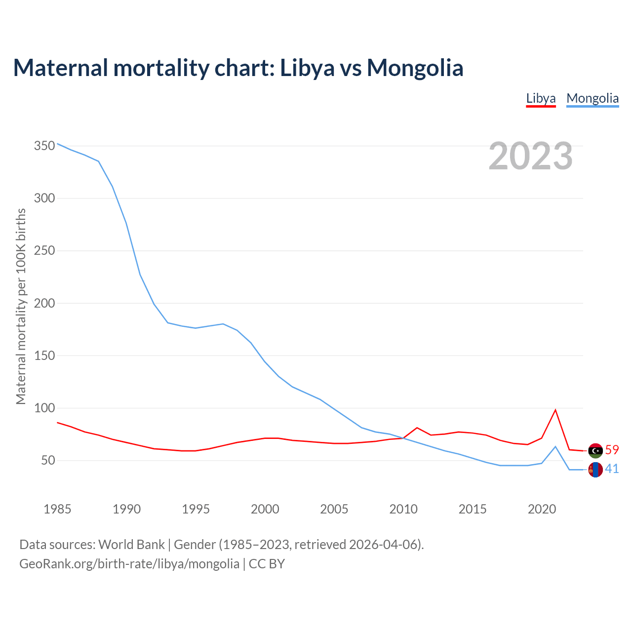 The maternal mortality rate, which is the probability of dying during childbirth or within 42 days of pregnancy termination, is 59 deaths per 100,000 live births in Libya, compared to 41 deaths in Mongolia.