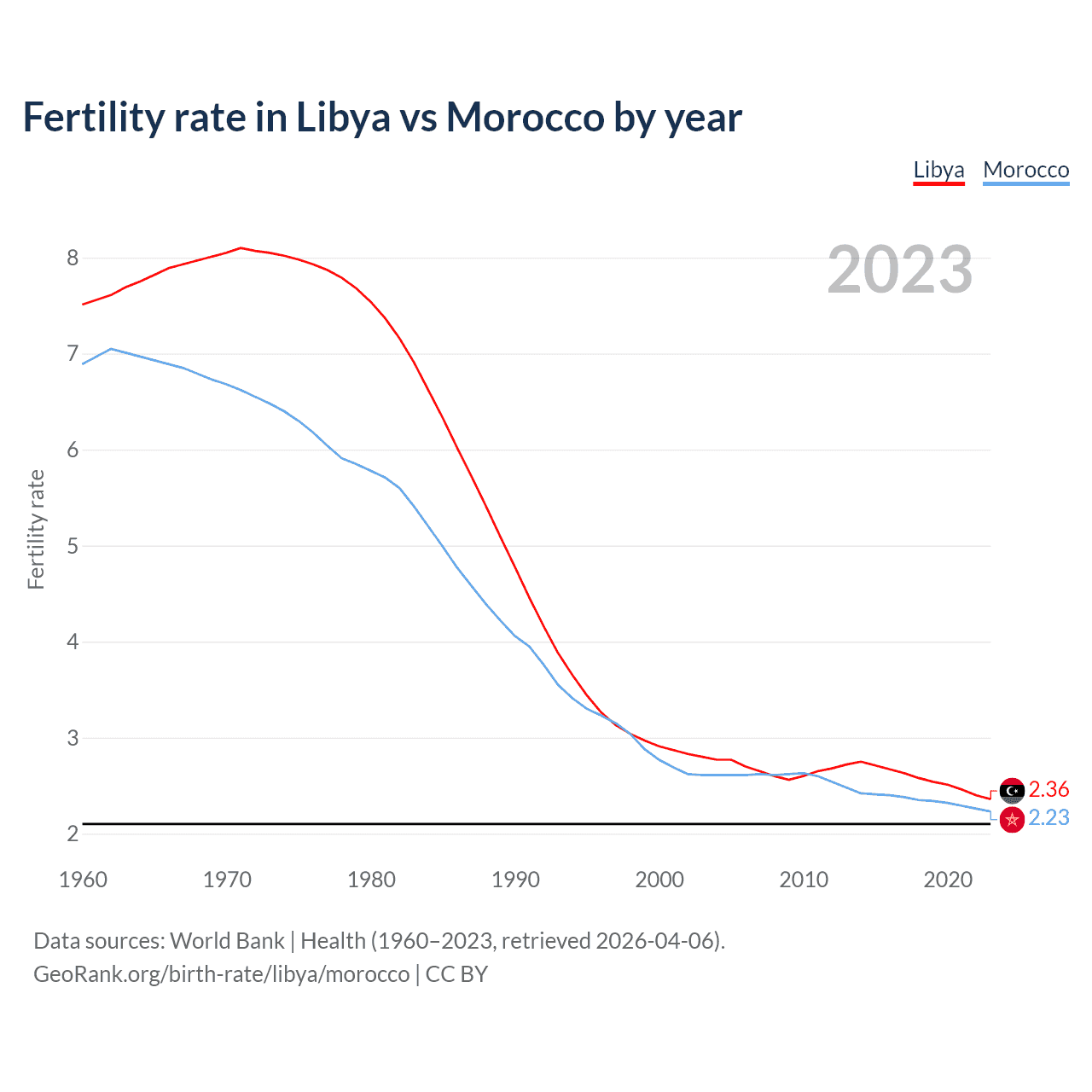1960 vs 2023, the fertility rate has decreased by 68.6% in Libya and by 67.6% in Morocco — in 1960, it was 7.51 and 6.89, respectively.
