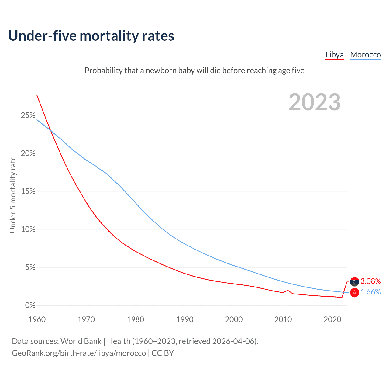 The chance that a newborn baby will die before reaching age five is 3.08% in Libya and 1.66% in Morocco. Above is a chart with historical data on under-five mortality rates.