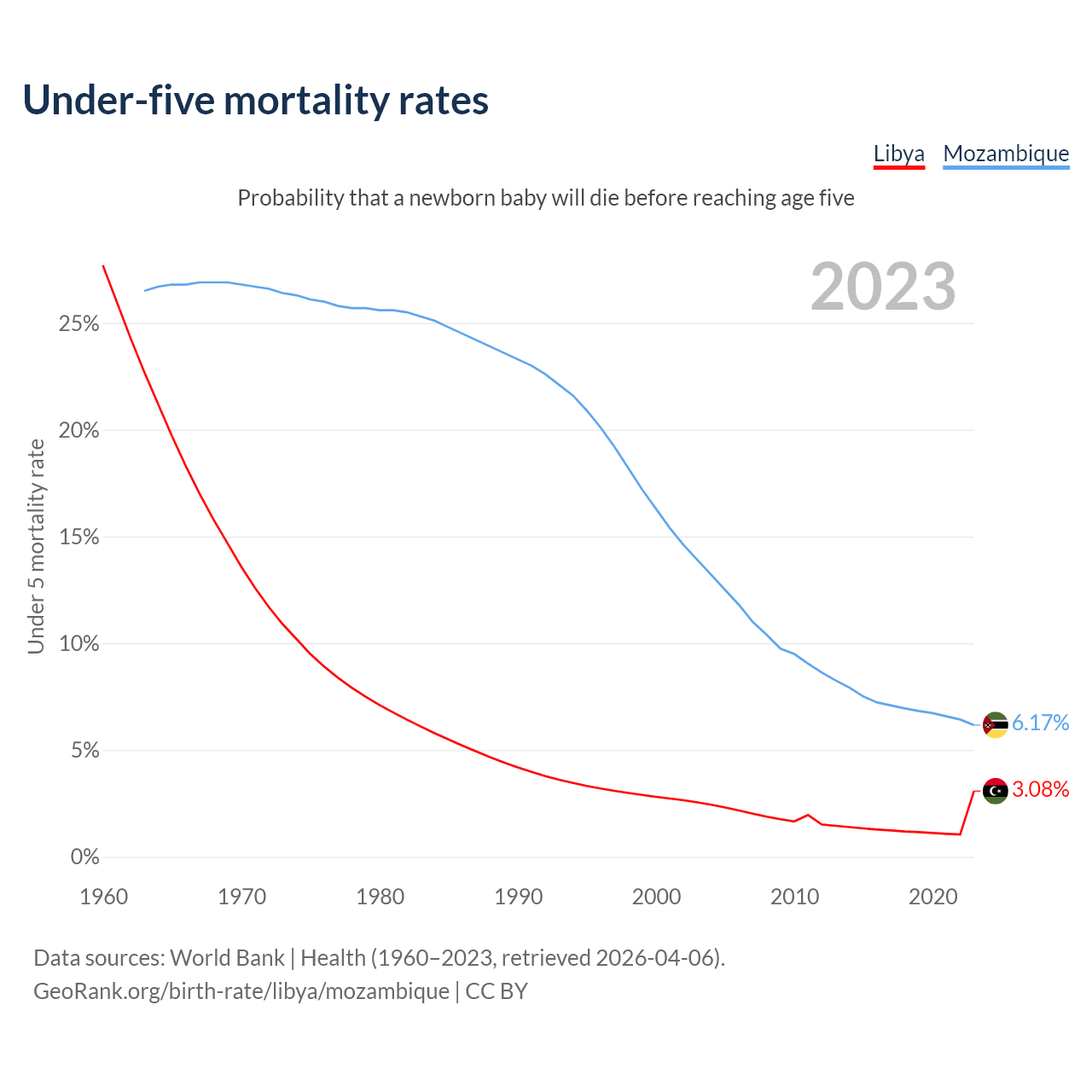 The chance that a newborn baby will die before reaching age five is 3.08% in Libya and 6.17% in Mozambique. Above is a chart with historical data on under-five mortality rates.
