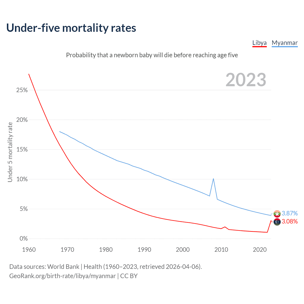 The chance that a newborn baby will die before reaching age five is 3.08% in Libya and 3.87% in Myanmar. Above is a chart with historical data on under-five mortality rates.