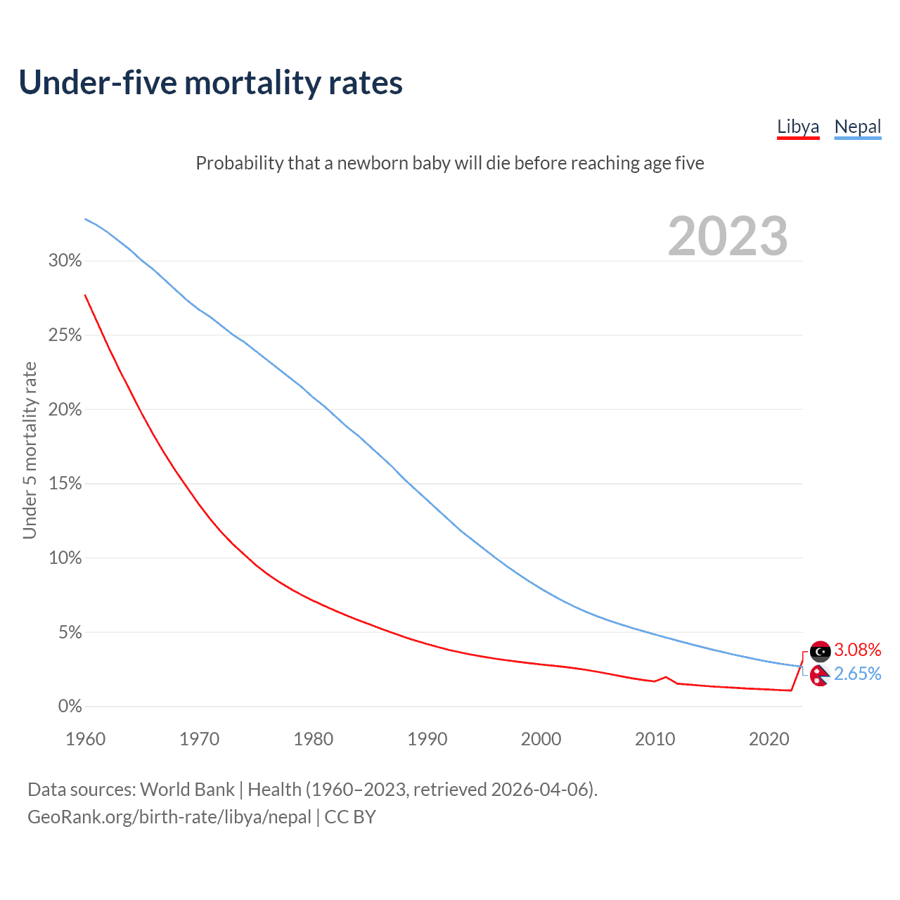 The chance that a newborn baby will die before reaching age five is 3.08% in Libya and 2.65% in Nepal. Above is a chart with historical data on under-five mortality rates.