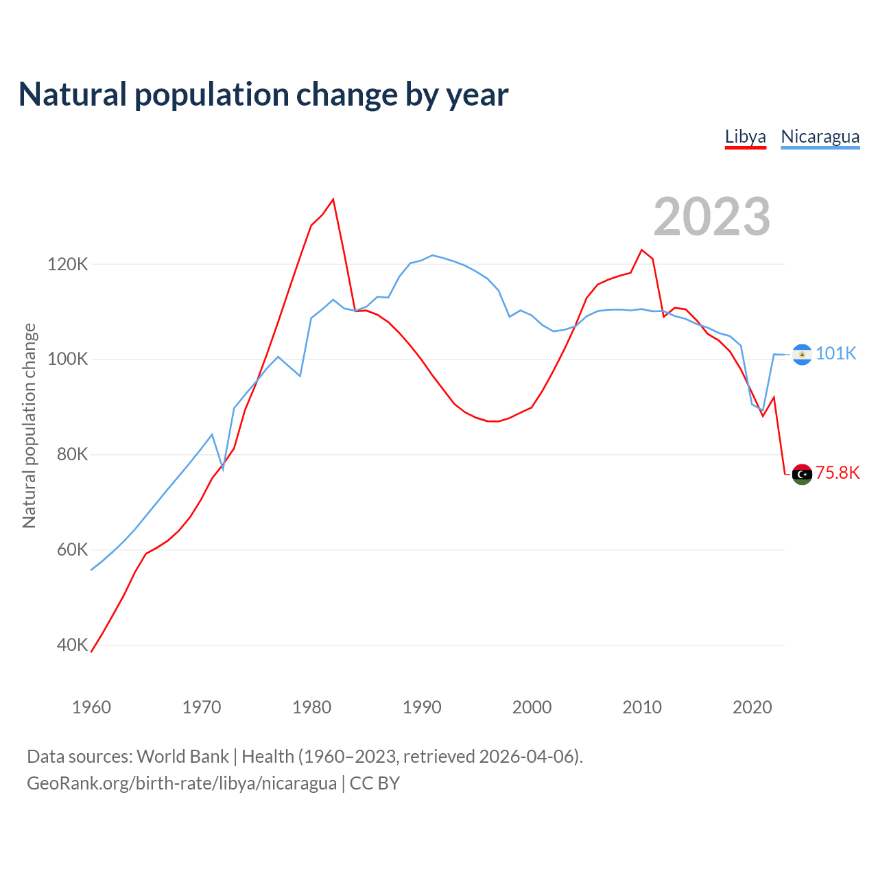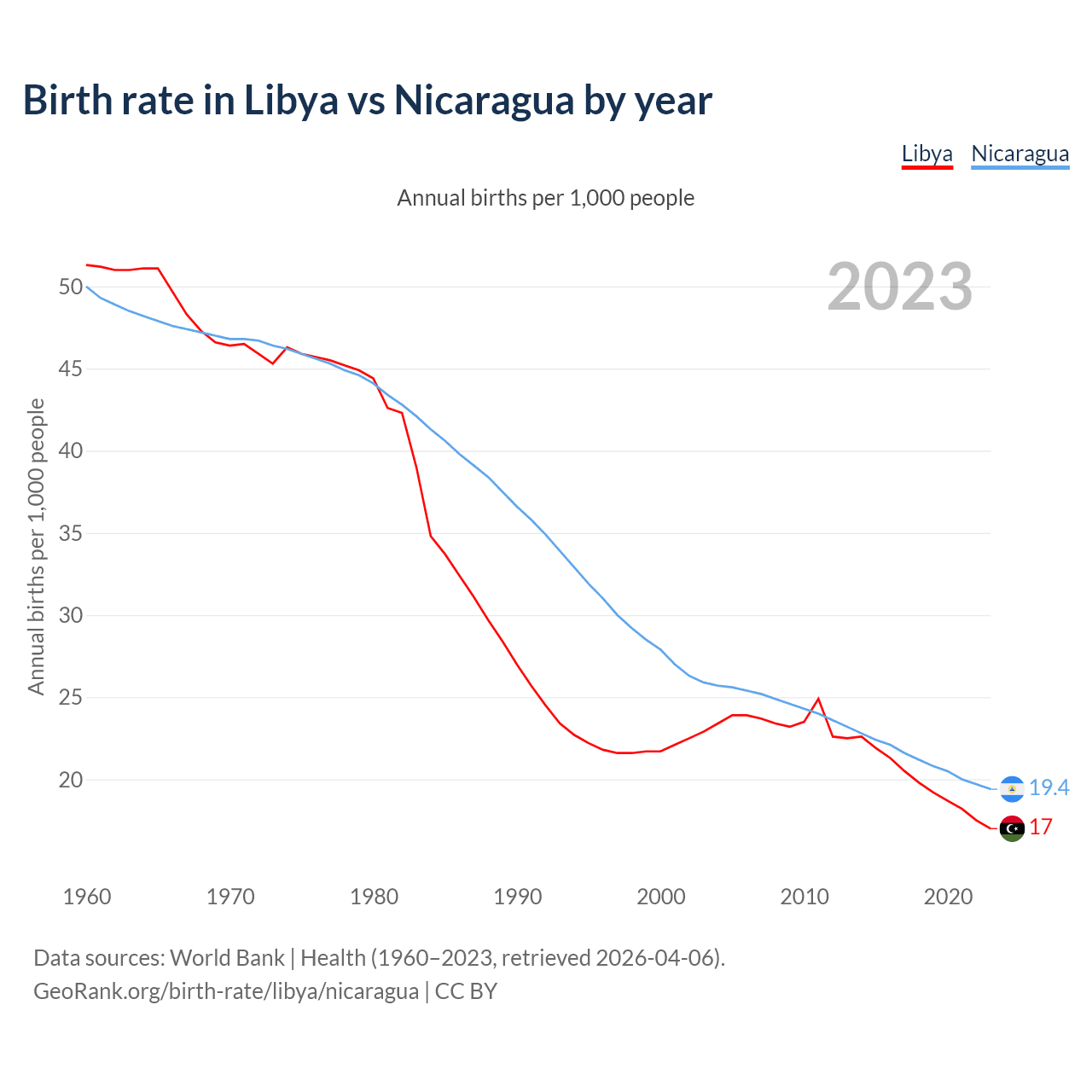 Libya has an annual birth rate of 17 births per 1,000 people, compared to 19.4 for Nicaragua. The average number of children a woman is expected to have during her lifetime — the fertility rate, is 2.36 in Libya and 2.22 in Nicaragua — 5.82% difference.