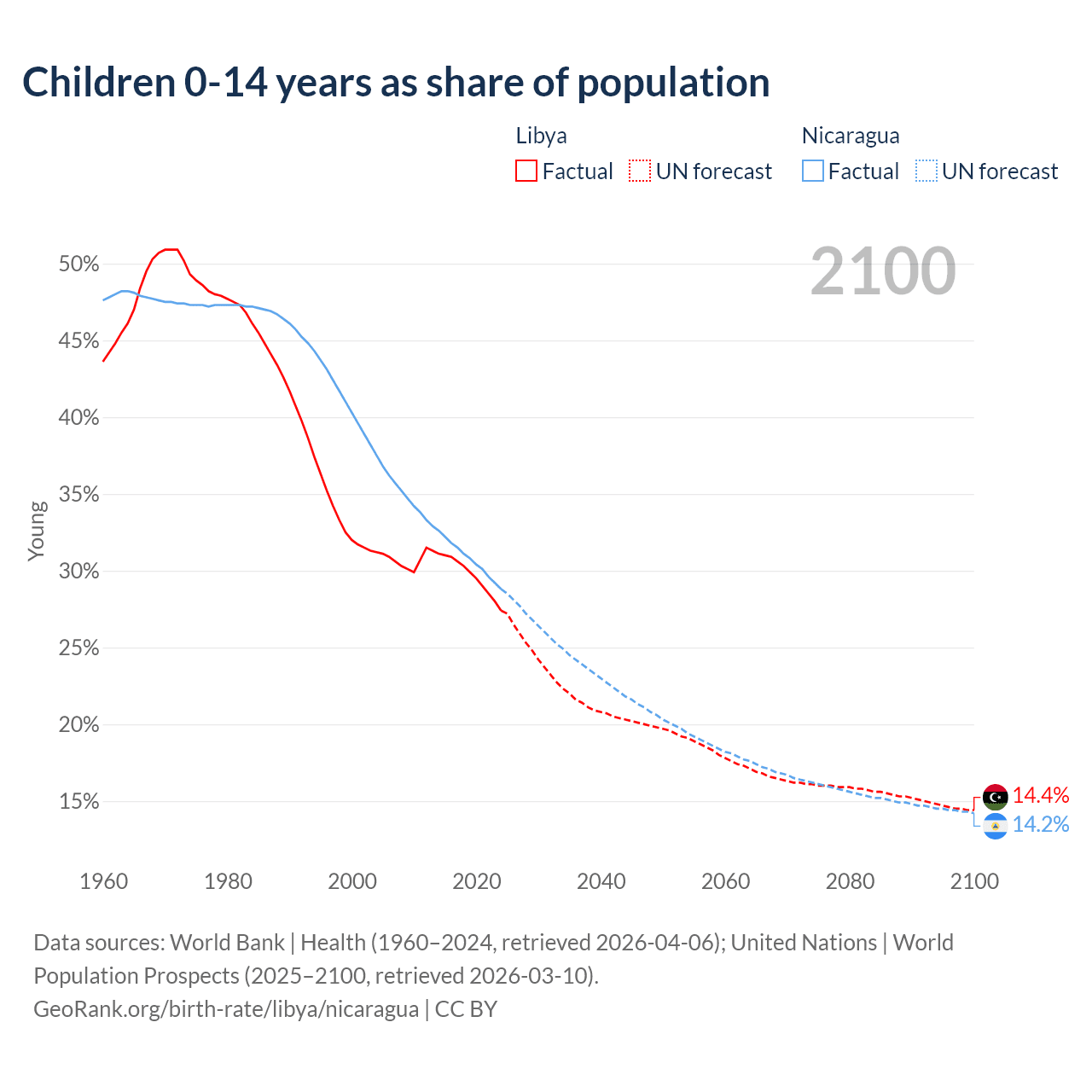 According to the latest available data on birth rates, the fertility rate in Libya was 2.36 children per woman in 2023, compared to 2.22 in Nicaragua in 2023. The replacement level is considered to be 2.1 children per woman.
