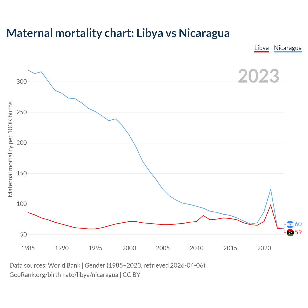 The maternal mortality rate, which is the probability of dying during childbirth or within 42 days of pregnancy termination, is 59 deaths per 100,000 live births in Libya, compared to 60 deaths in Nicaragua.