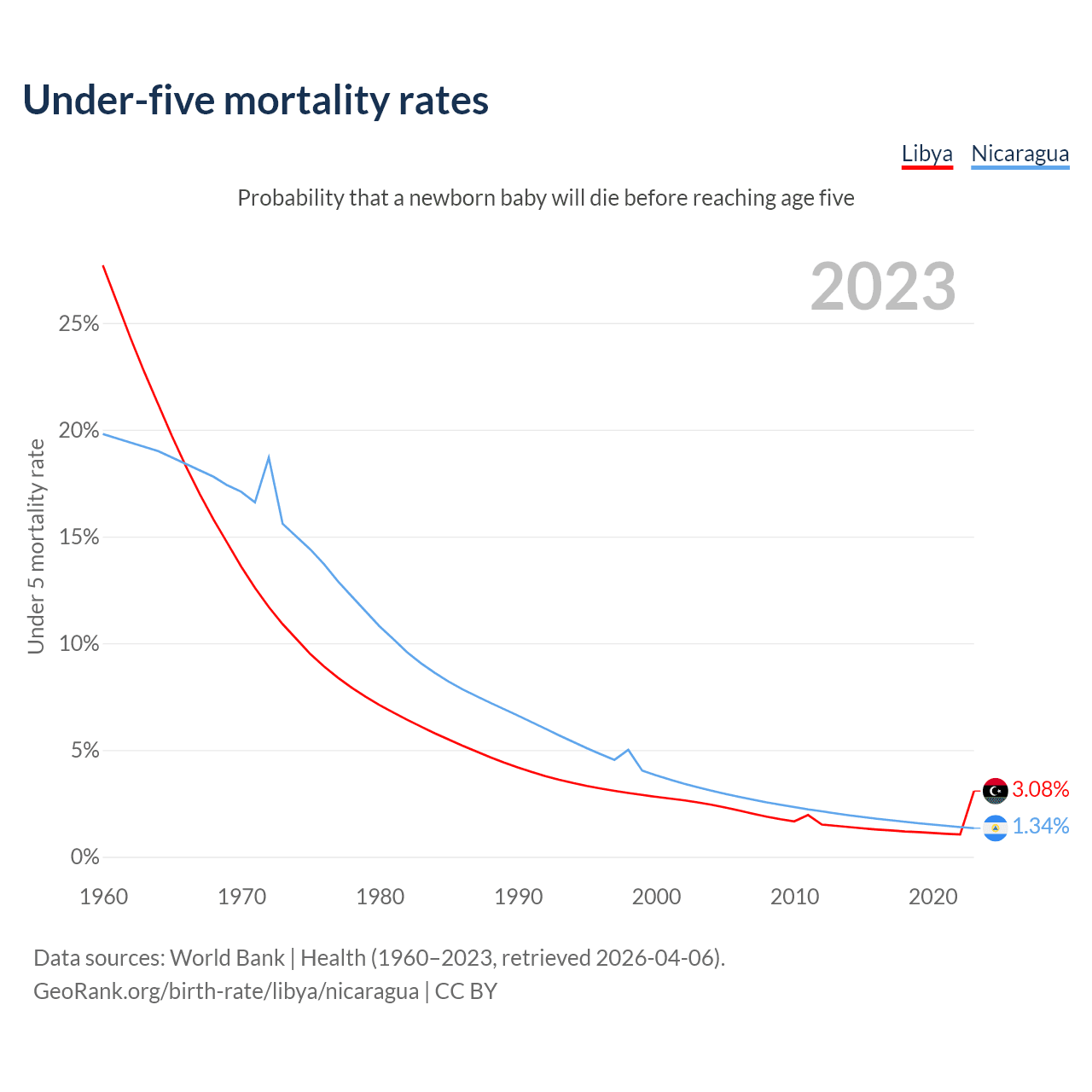 The chance that a newborn baby will die before reaching age five is 3.08% in Libya and 1.34% in Nicaragua. Above is a chart with historical data on under-five mortality rates.