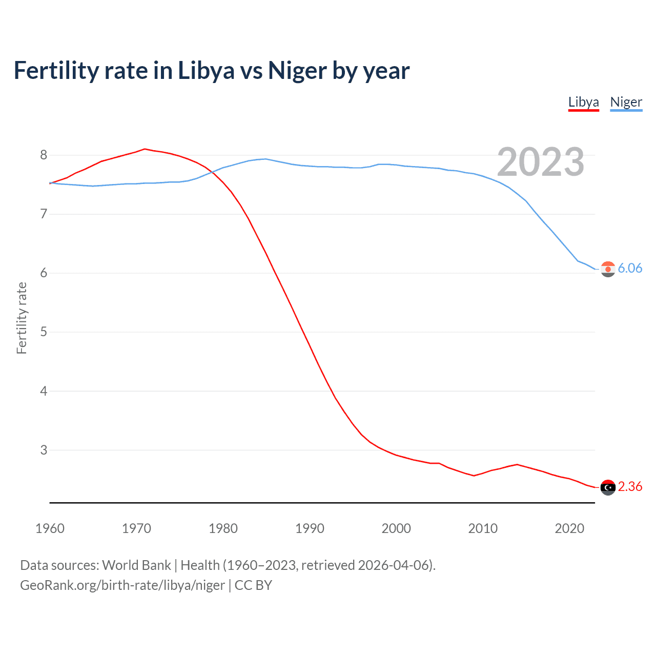 1960 vs 2023, the fertility rate has decreased by 68.6% in Libya and by 19.5% in Niger — in 1960, it was 7.51 and 7.53, respectively.