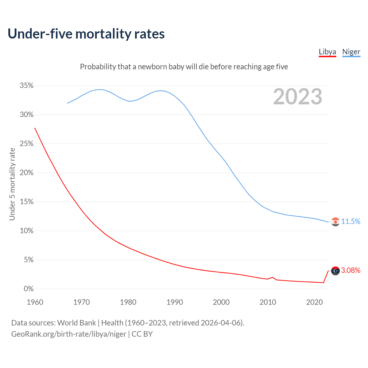 The chance that a newborn baby will die before reaching age five is 3.08% in Libya and 11.5% in Niger. Above is a chart with historical data on under-five mortality rates.