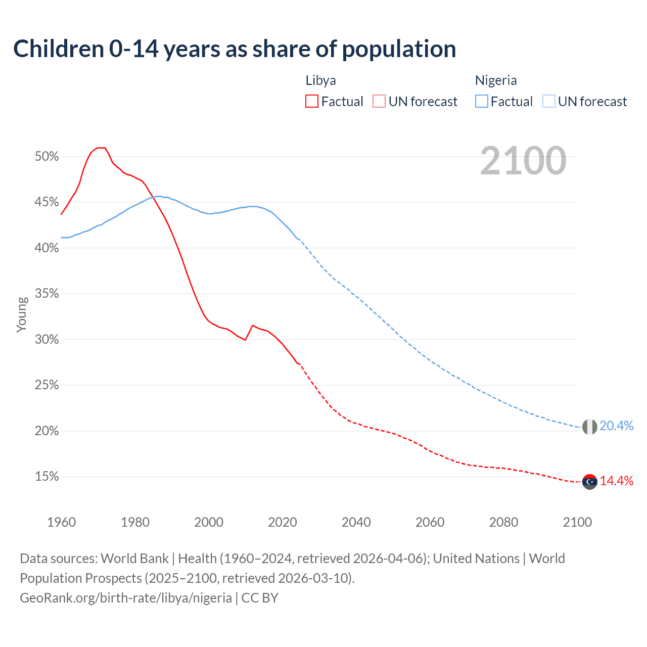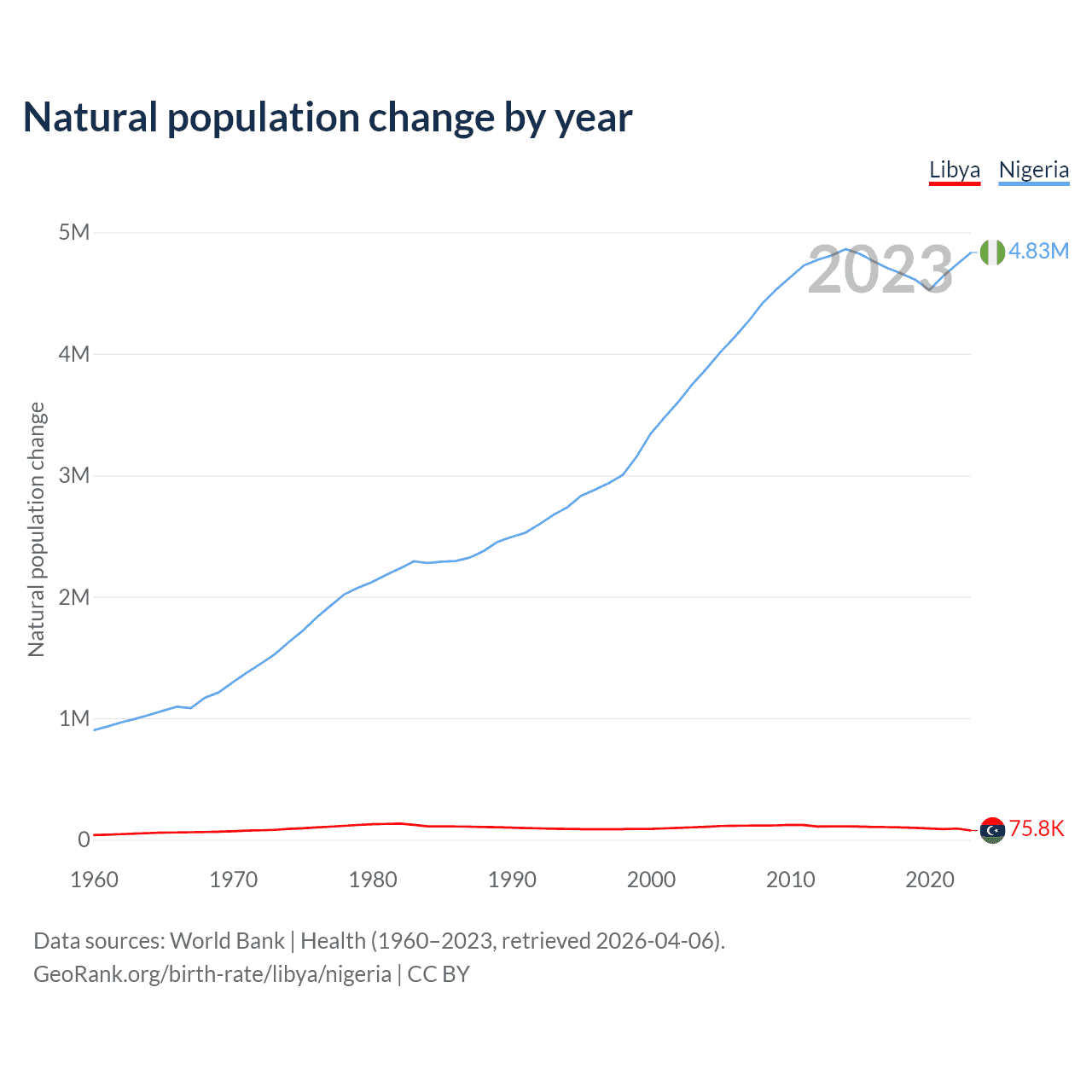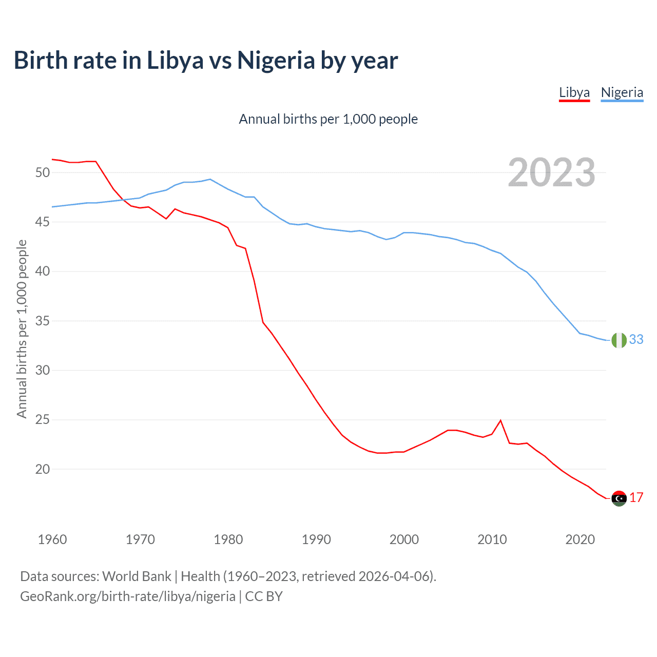 According to the latest available data on birth rates, the fertility rate in Libya was 2.36 children per woman in 2023, compared to 4.48 in Nigeria in 2023. The replacement level is considered to be 2.1 children per woman.