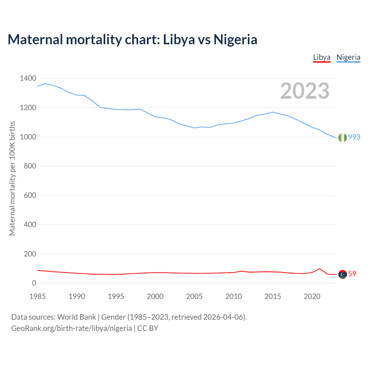 The maternal mortality rate, which is the probability of dying during childbirth or within 42 days of pregnancy termination, is 59 deaths per 100,000 live births in Libya, compared to 993 deaths in Nigeria.