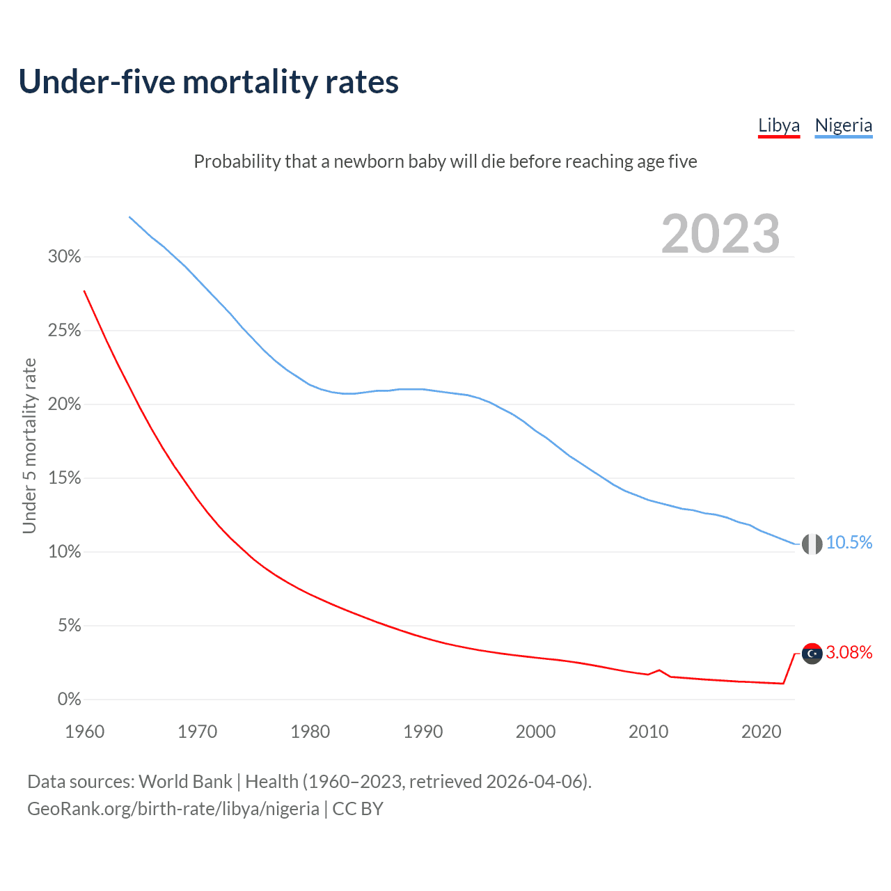 The chance that a newborn baby will die before reaching age five is 3.08% in Libya and 10.5% in Nigeria. Above is a chart with historical data on under-five mortality rates.