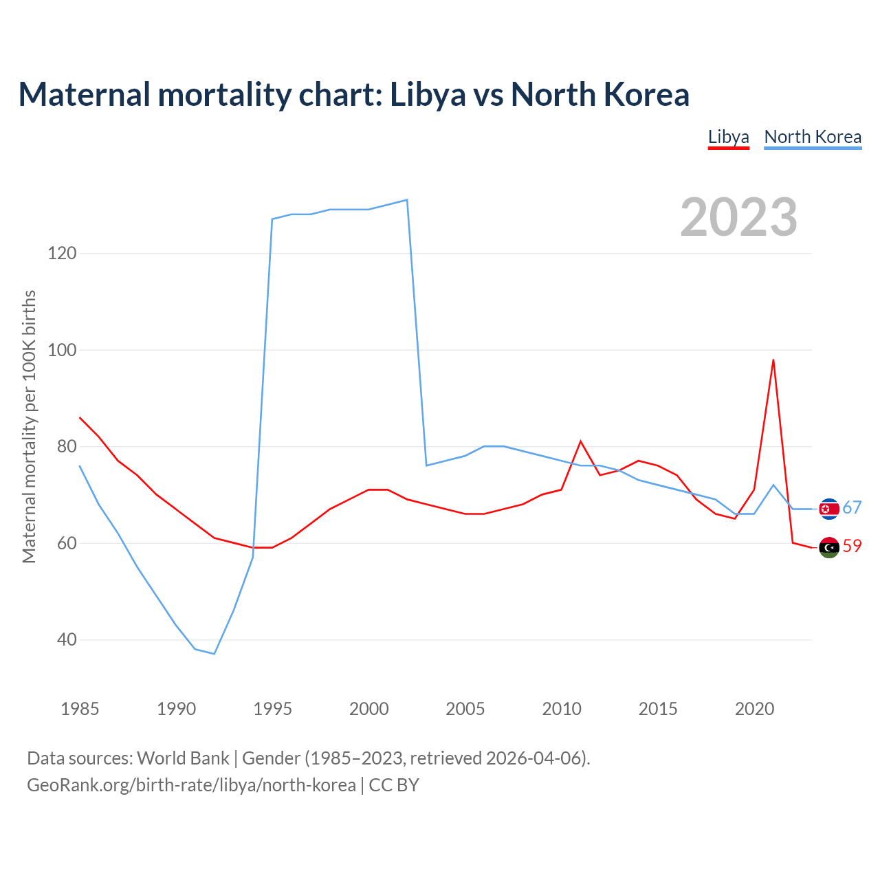 The maternal mortality rate, which is the probability of dying during childbirth or within 42 days of pregnancy termination, is 59 deaths per 100,000 live births in Libya, compared to 67 deaths in North Korea.