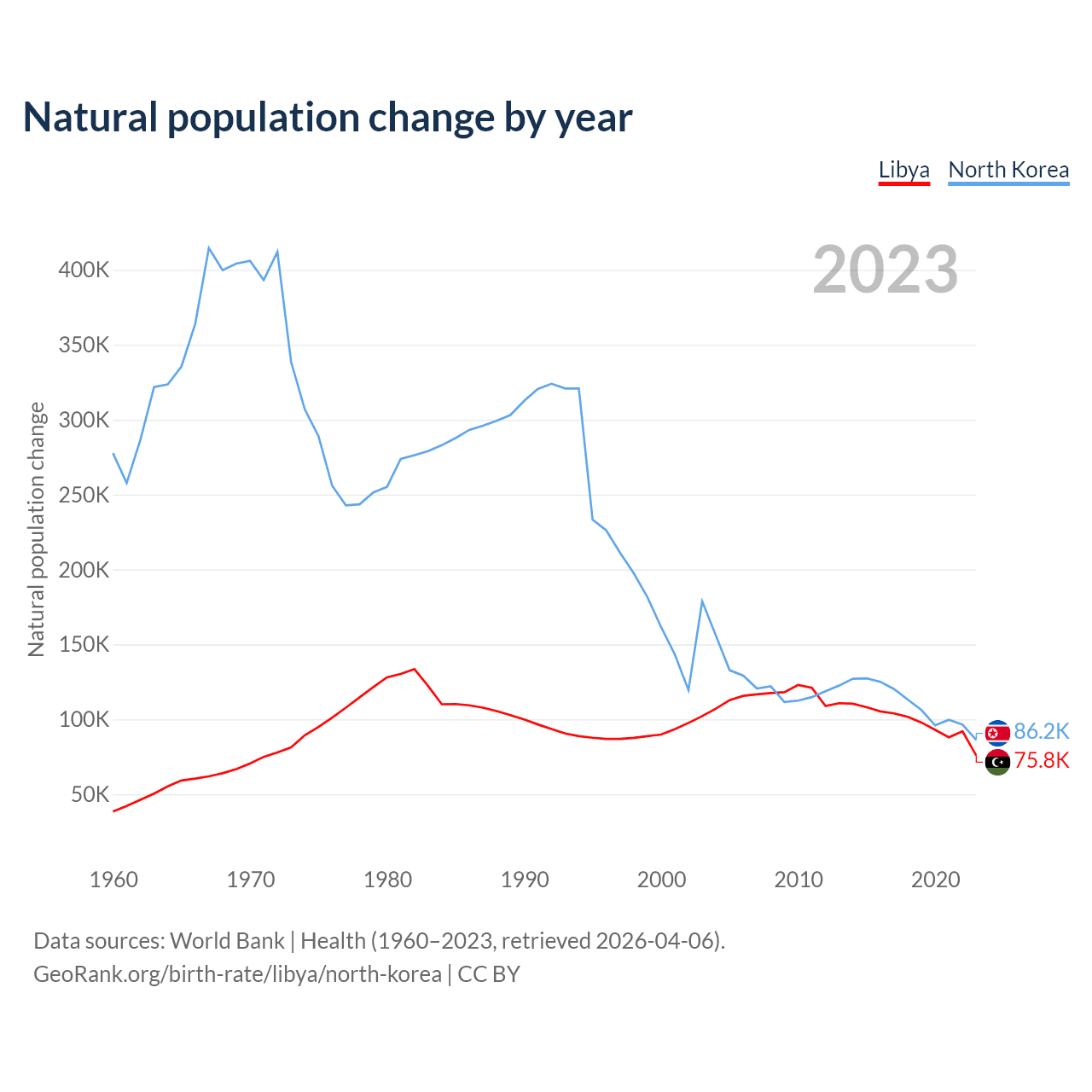 Libya has an annual birth rate of 17 births per 1,000 people, compared to 12.9 for North Korea. The average number of children a woman is expected to have during her lifetime — the fertility rate, is 2.36 in Libya and 1.78 in North Korea — 24.4% difference.
