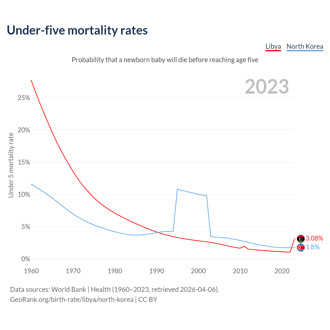 The chance that a newborn baby will die before reaching age five is 3.08% in Libya and 1.8% in North Korea. Above is a chart with historical data on under-five mortality rates.