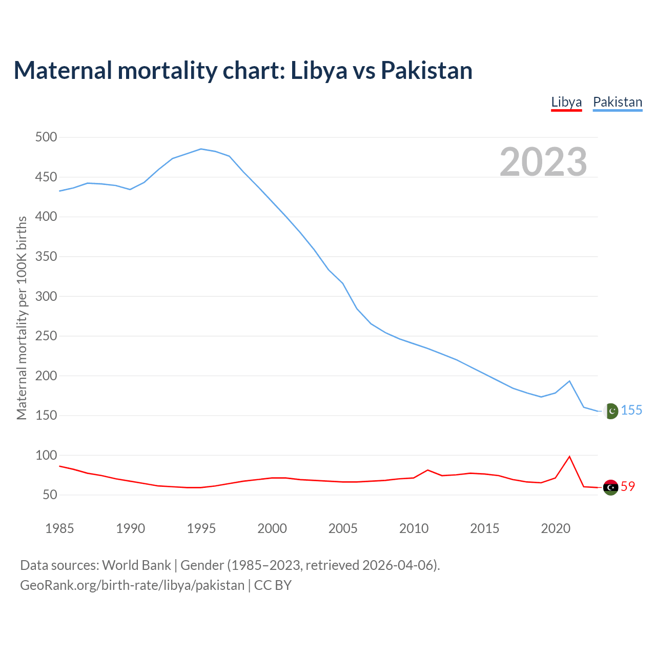 The maternal mortality rate, which is the probability of dying during childbirth or within 42 days of pregnancy termination, is 59 deaths per 100,000 live births in Libya, compared to 155 deaths in Pakistan.