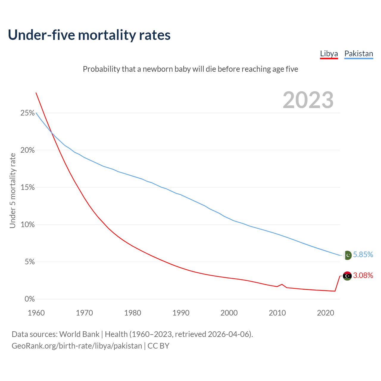 The chance that a newborn baby will die before reaching age five is 3.08% in Libya and 5.85% in Pakistan. Above is a chart with historical data on under-five mortality rates.
