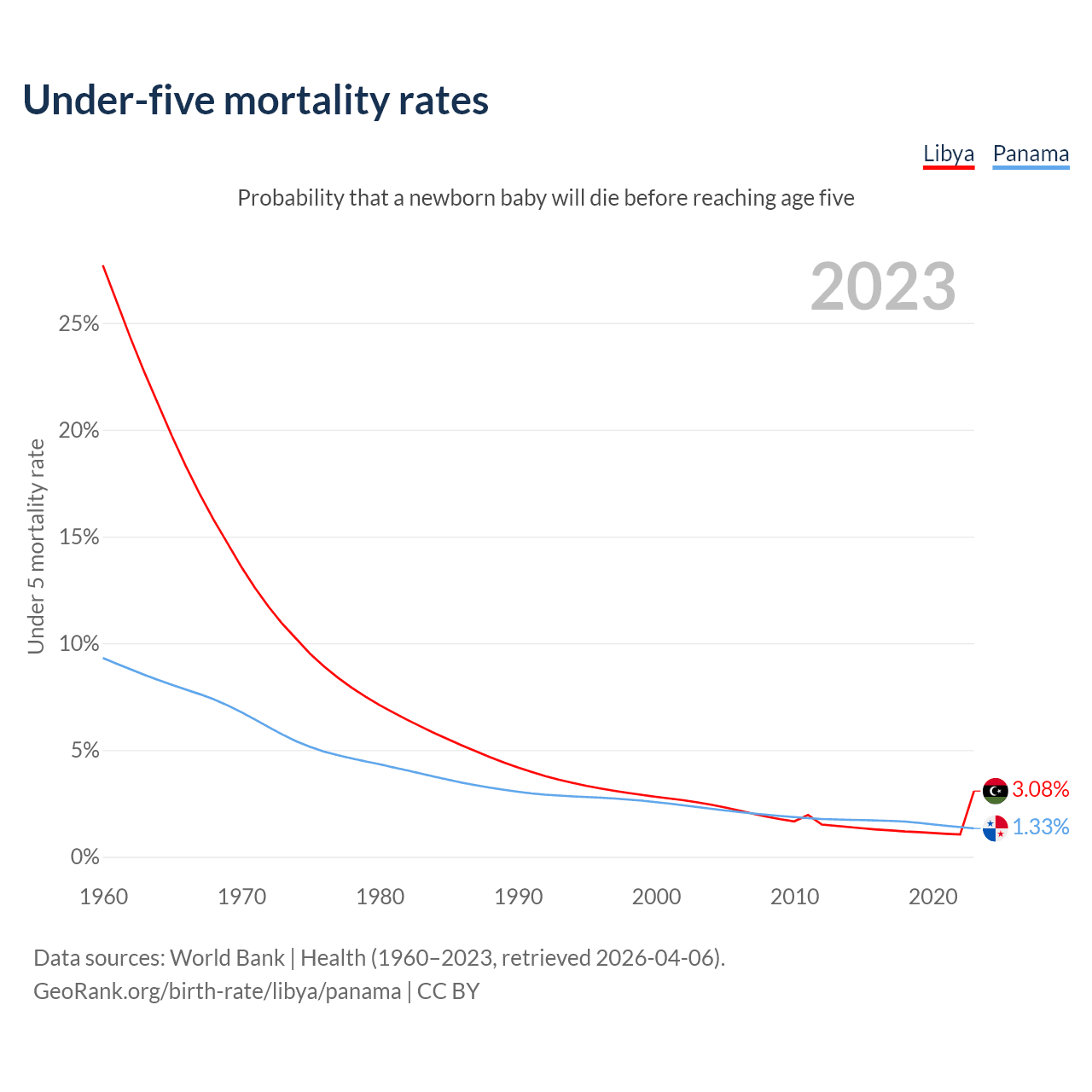 The chance that a newborn baby will die before reaching age five is 3.08% in Libya and 1.33% in Panama. Above is a chart with historical data on under-five mortality rates.