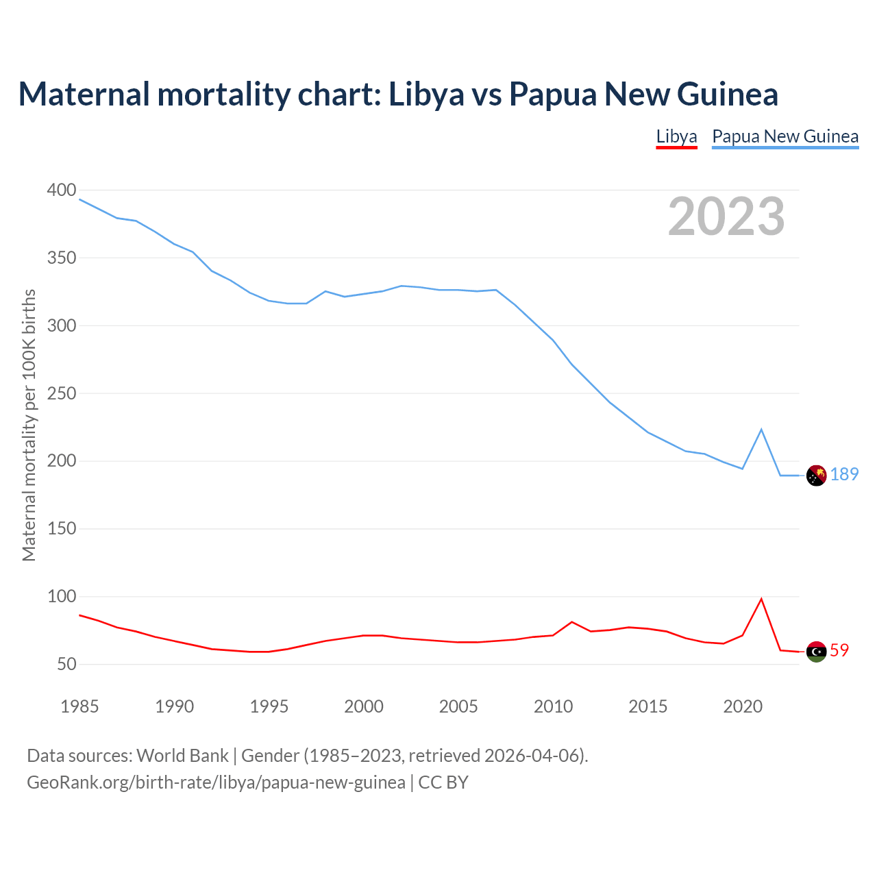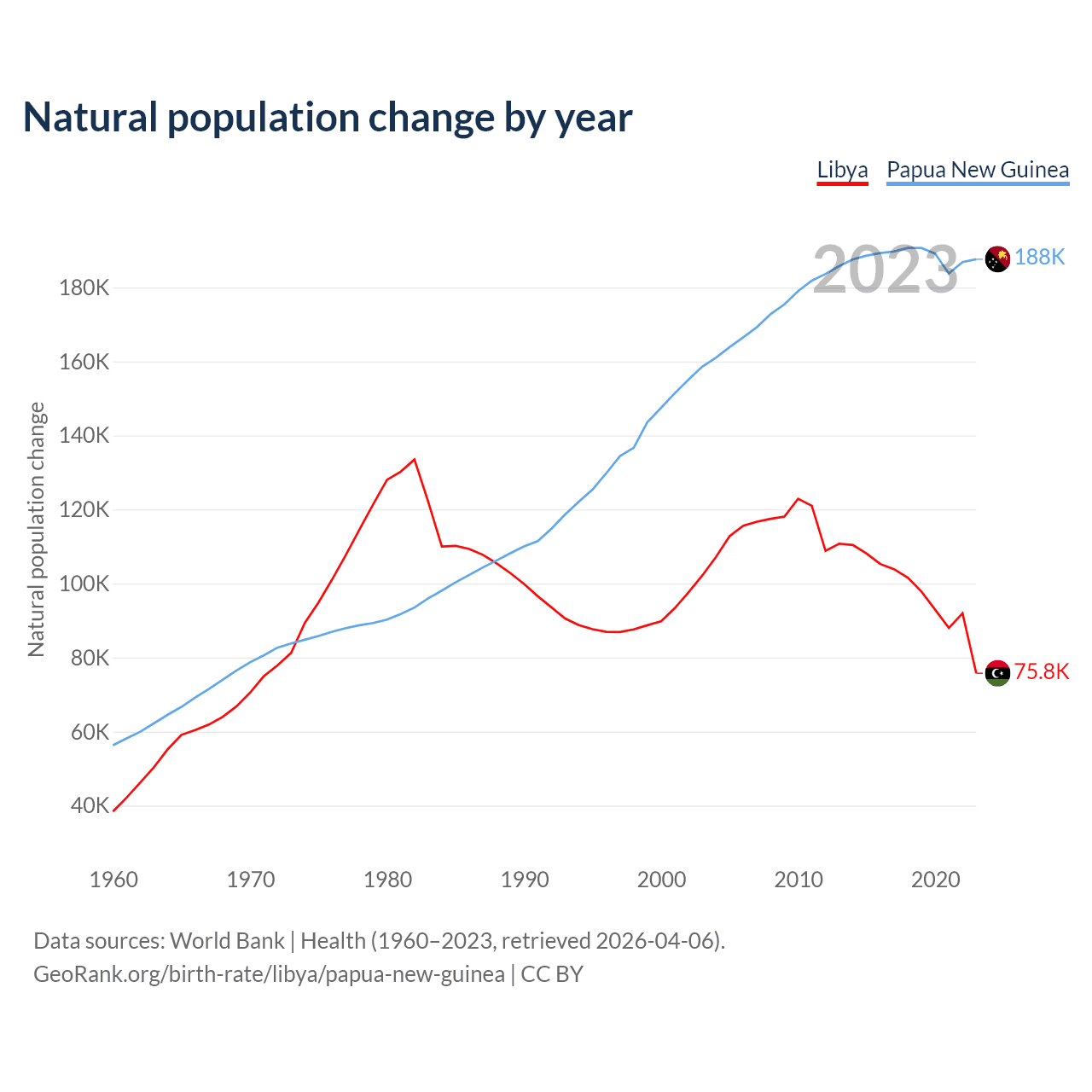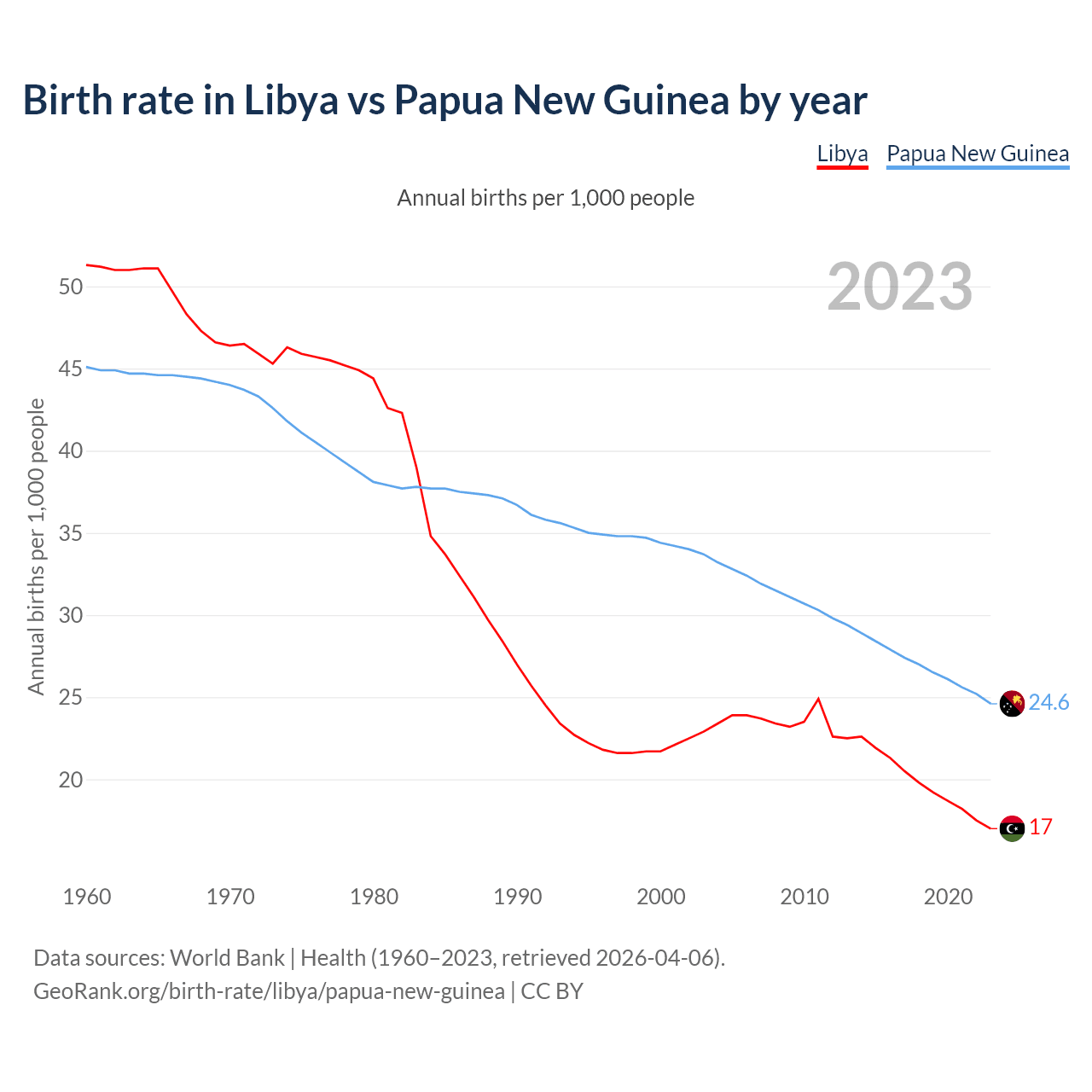 Libya has an annual birth rate of 17 births per 1,000 people, compared to 24.6 for Papua New Guinea. The average number of children a woman is expected to have during her lifetime — the fertility rate, is 2.36 in Libya and 3.1 in Papua New Guinea — 31.6% difference.