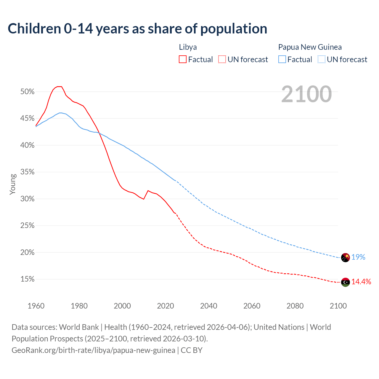 According to the latest available data on birth rates, the fertility rate in Libya was 2.36 children per woman in 2023, compared to 3.1 in Papua New Guinea in 2023. The replacement level is considered to be 2.1 children per woman.