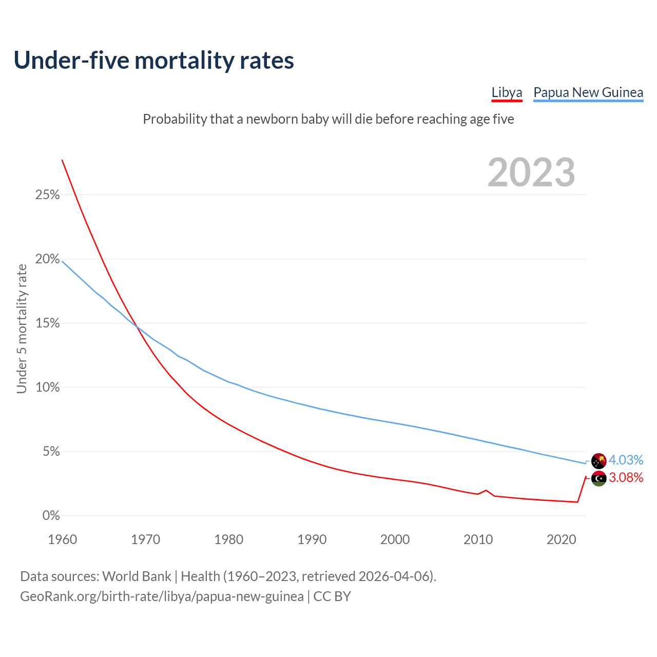 The chance that a newborn baby will die before reaching age five is 3.08% in Libya and 4.03% in Papua New Guinea. Above is a chart with historical data on under-five mortality rates.
