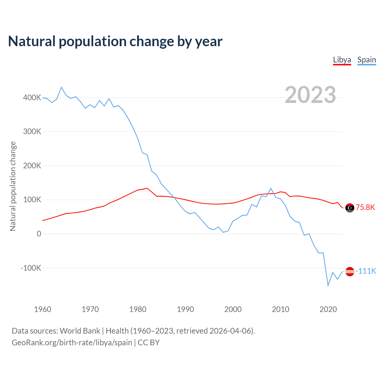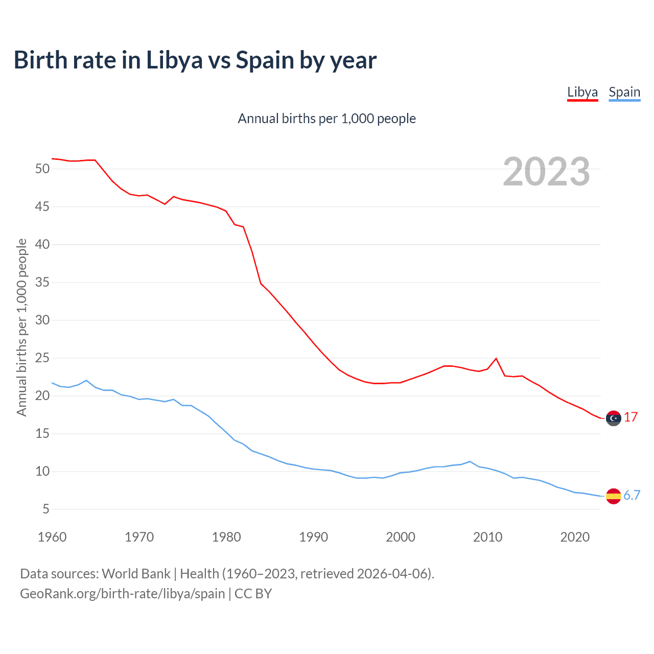 Libya has an annual birth rate of 17 births per 1,000 people, compared to 6.7 for Spain. The average number of children a woman is expected to have during her lifetime — the fertility rate, is 2.36 in Libya and 1.12 in Spain — 52.4% difference.