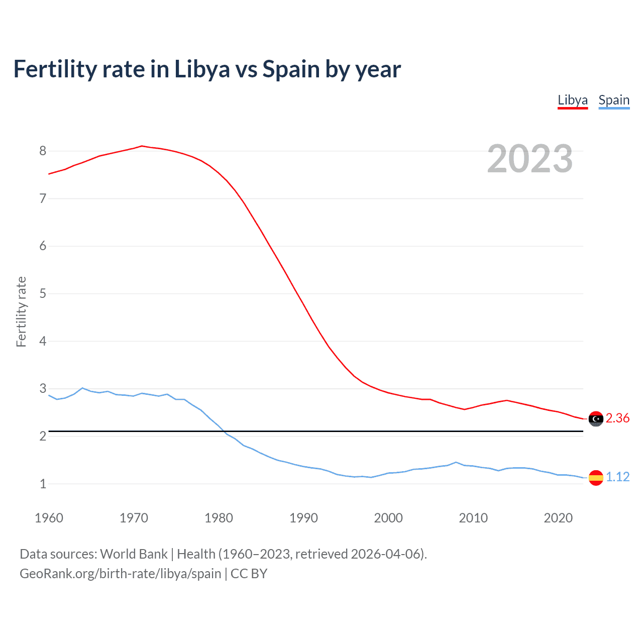 According to the latest available data on birth rates, the fertility rate in Libya was 2.36 children per woman in 2023, compared to 1.12 in Spain in 2023. The replacement level is considered to be 2.1 children per woman.