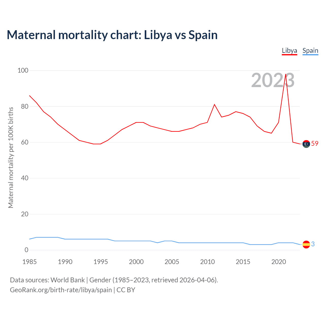 The maternal mortality rate, which is the probability of dying during childbirth or within 42 days of pregnancy termination, is 59 deaths per 100,000 live births in Libya, compared to 3 deaths in Spain.