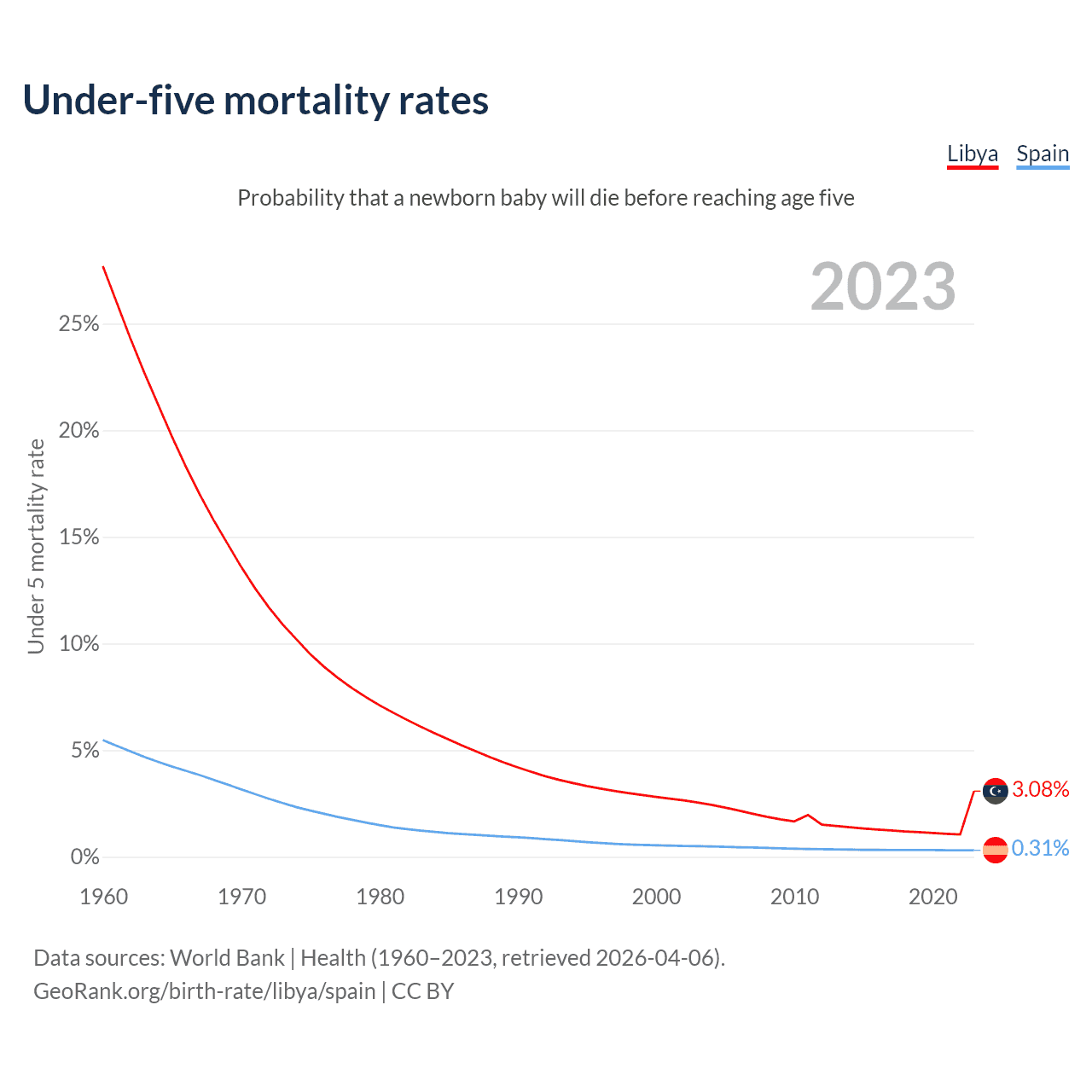 The chance that a newborn baby will die before reaching age five is 3.08% in Libya and 0.31% in Spain. Above is a chart with historical data on under-five mortality rates.