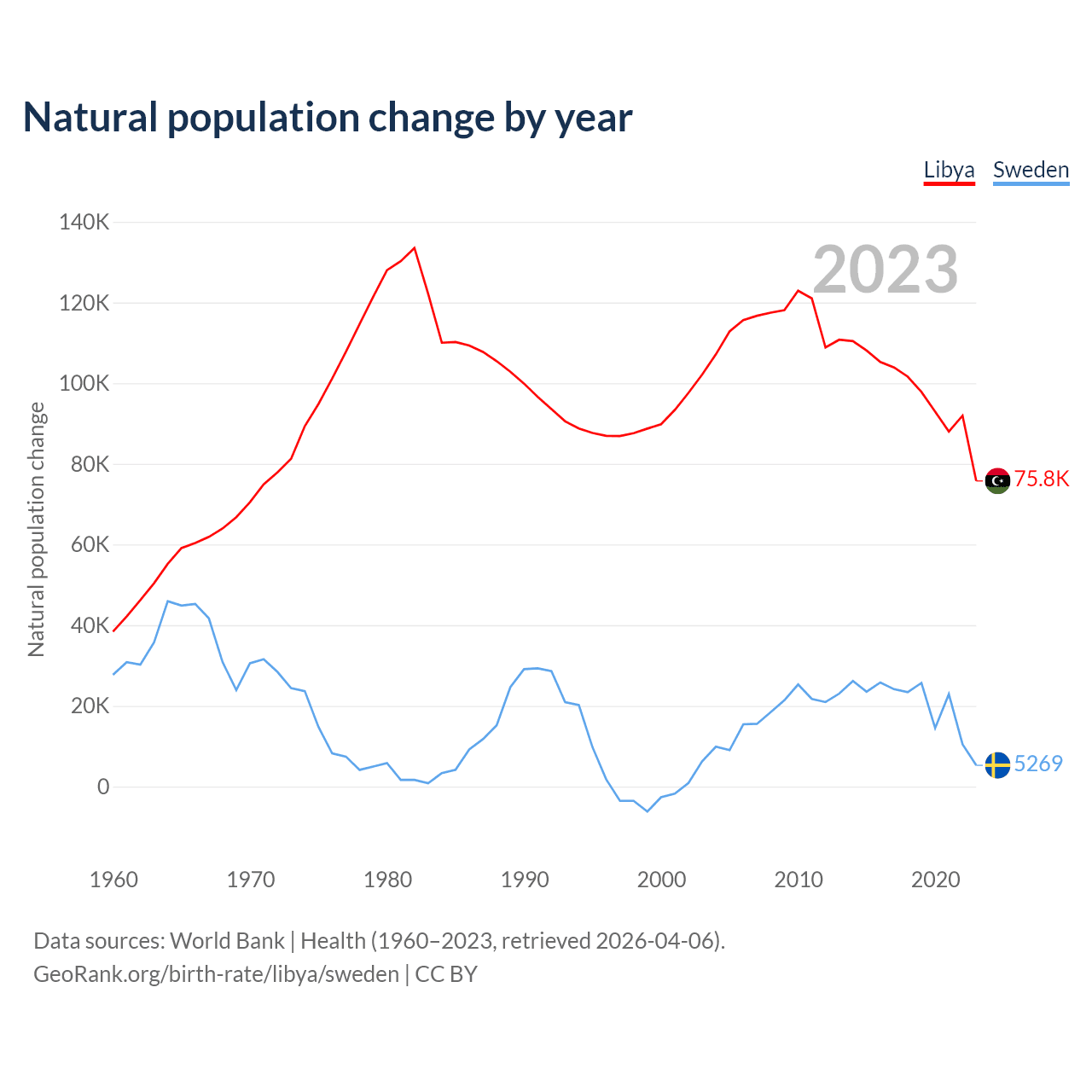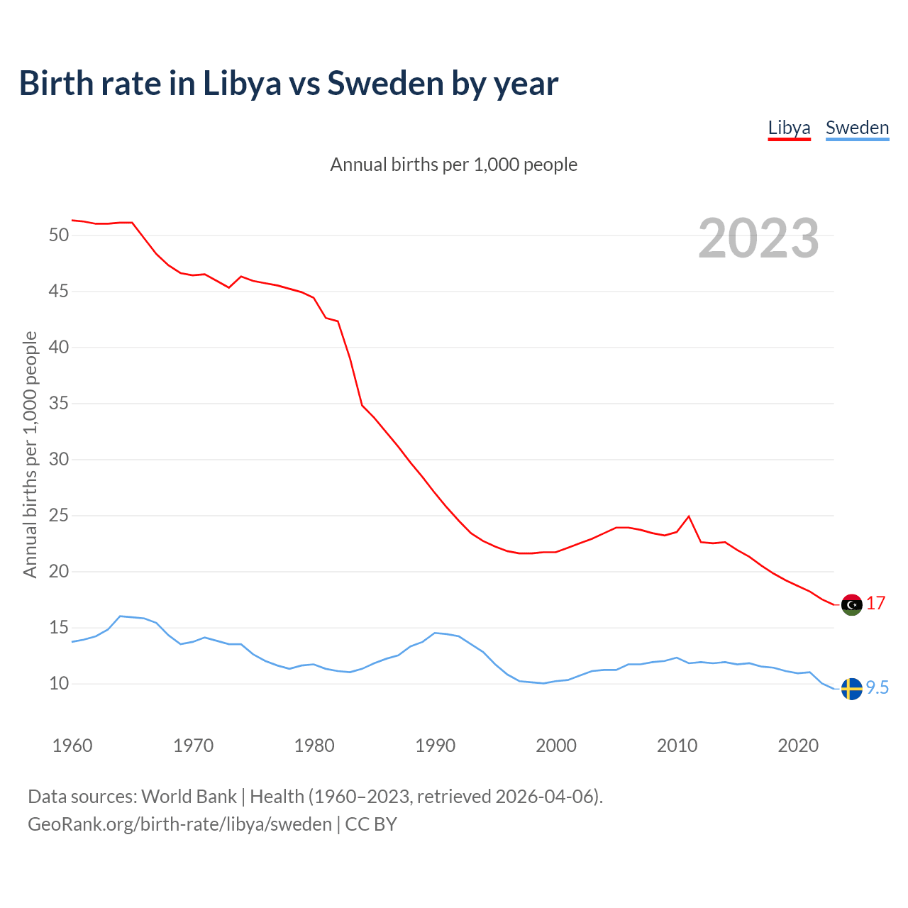 Libya has an annual birth rate of 17 births per 1,000 people, compared to 9.5 for Sweden. The average number of children a woman is expected to have during her lifetime — the fertility rate, is 2.36 in Libya and 1.45 in Sweden — 38.4% difference.