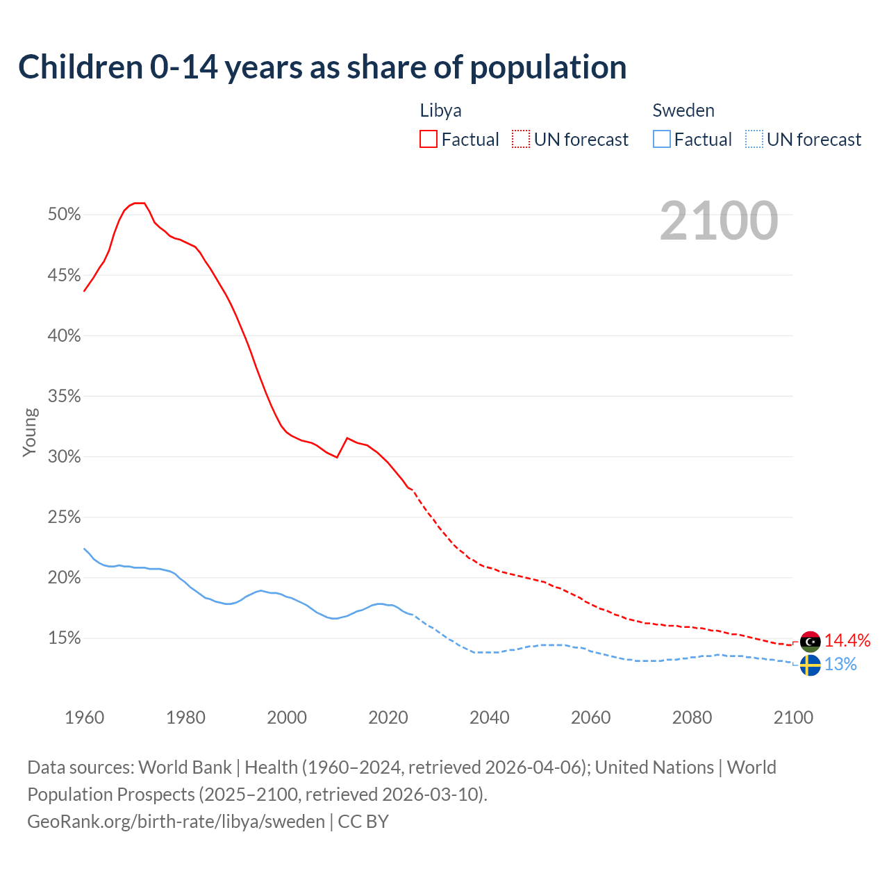 According to the latest available data on birth rates, the fertility rate in Libya was 2.36 children per woman in 2023, compared to 1.45 in Sweden in 2023. The replacement level is considered to be 2.1 children per woman.
