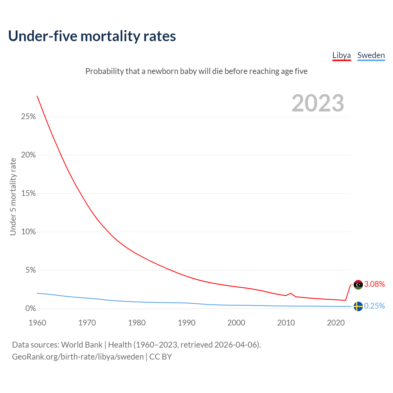 The chance that a newborn baby will die before reaching age five is 3.08% in Libya and 0.25% in Sweden. Above is a chart with historical data on under-five mortality rates.