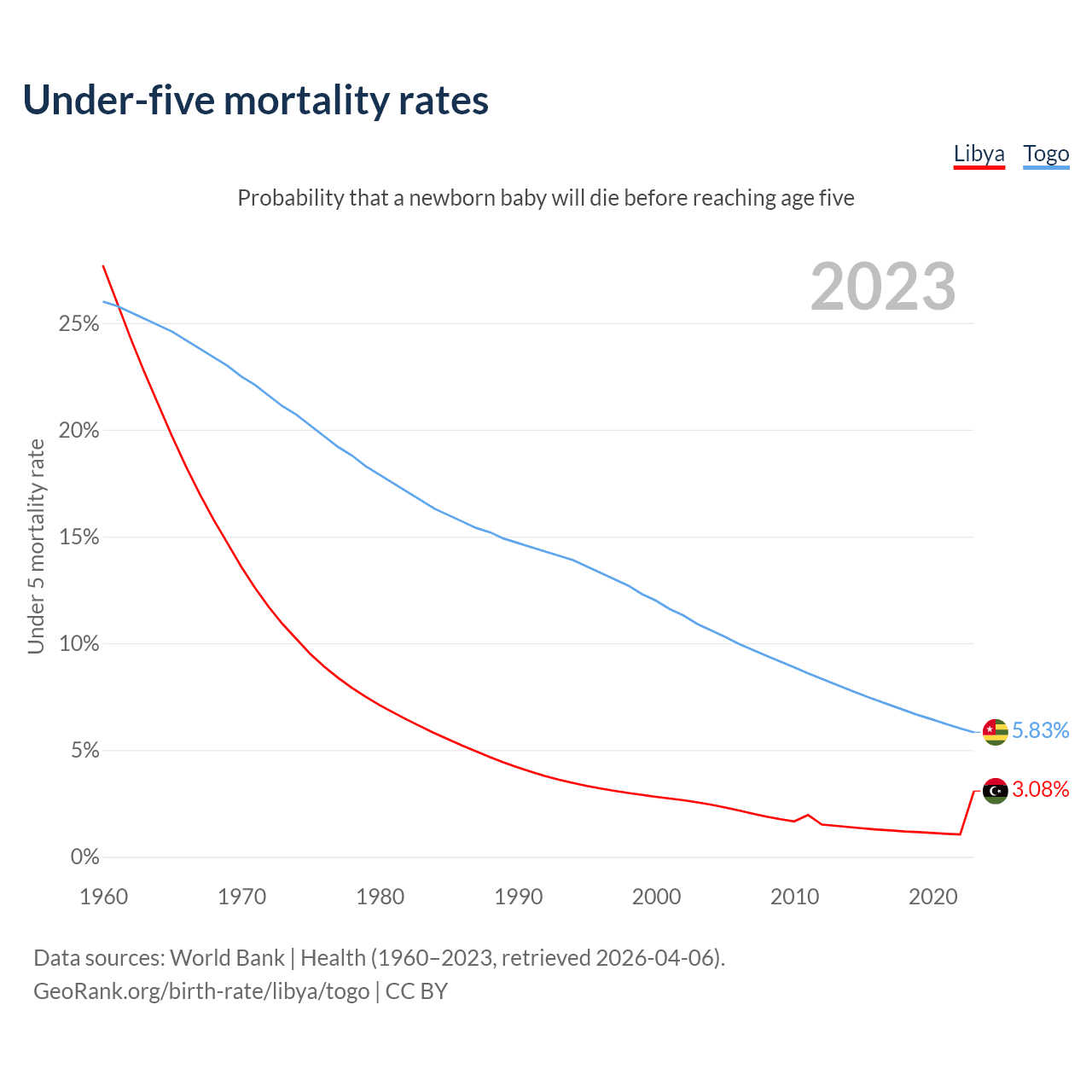 The chance that a newborn baby will die before reaching age five is 3.08% in Libya and 5.83% in Togo. Above is a chart with historical data on under-five mortality rates.