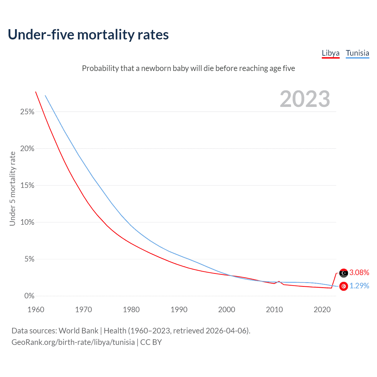 The chance that a newborn baby will die before reaching age five is 3.08% in Libya and 1.29% in Tunisia. Above is a chart with historical data on under-five mortality rates.