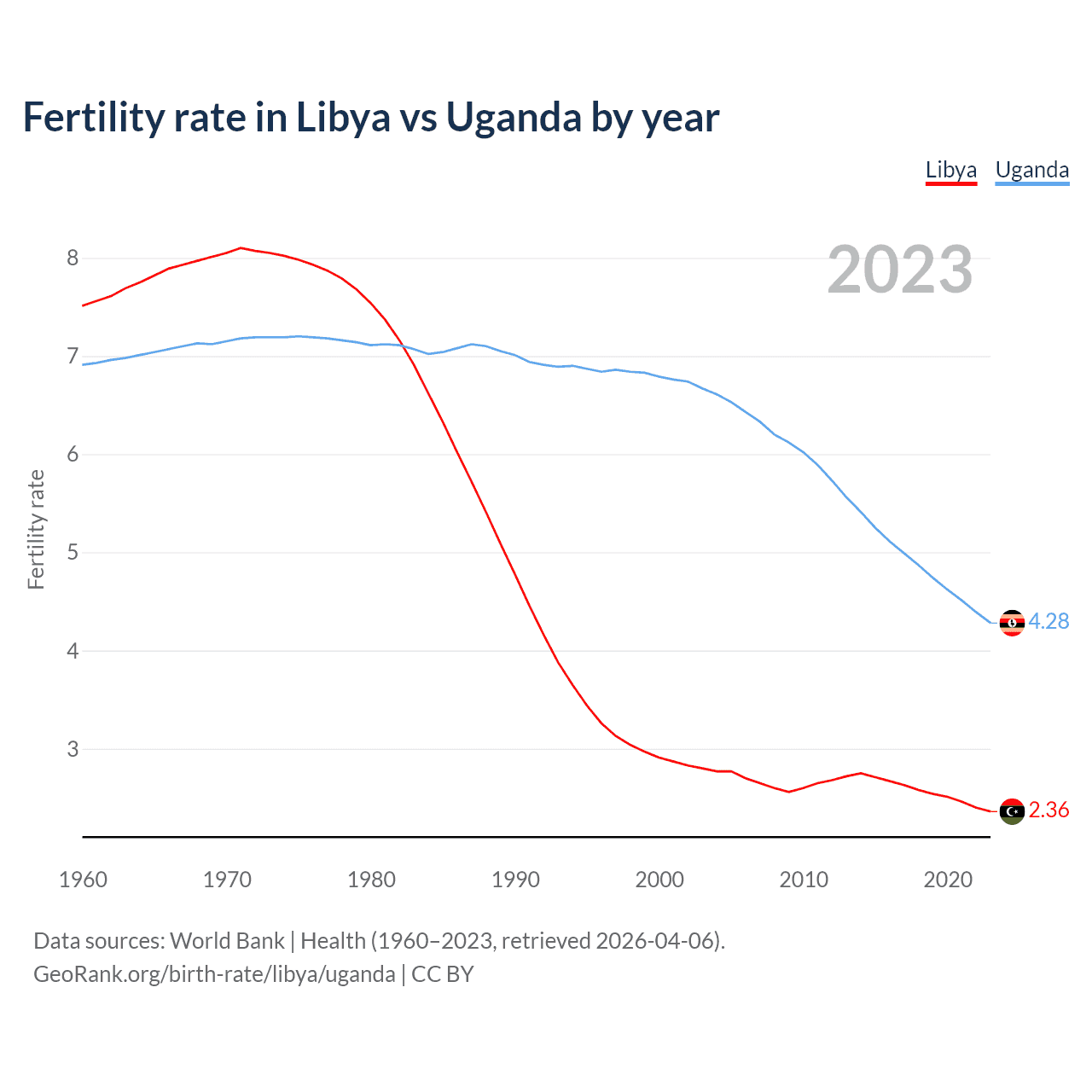 1960 vs 2023, the fertility rate has decreased by 68.6% in Libya and by 38% in Uganda — in 1960, it was 7.51 and 6.91, respectively.