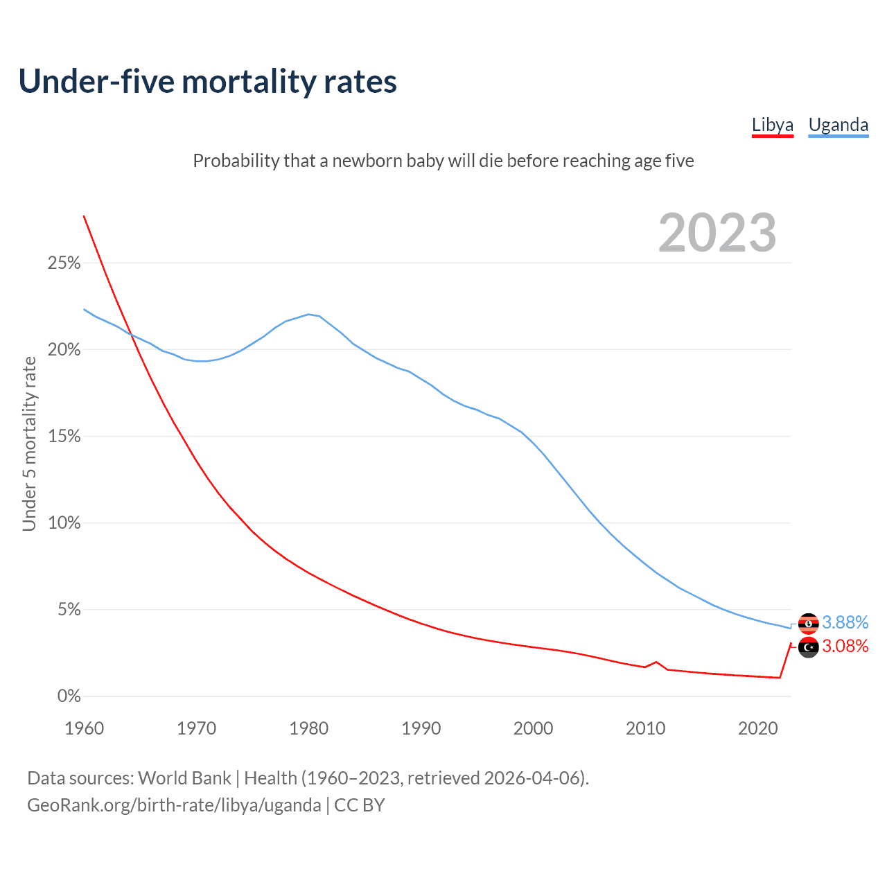 The chance that a newborn baby will die before reaching age five is 3.08% in Libya and 3.88% in Uganda. Above is a chart with historical data on under-five mortality rates.