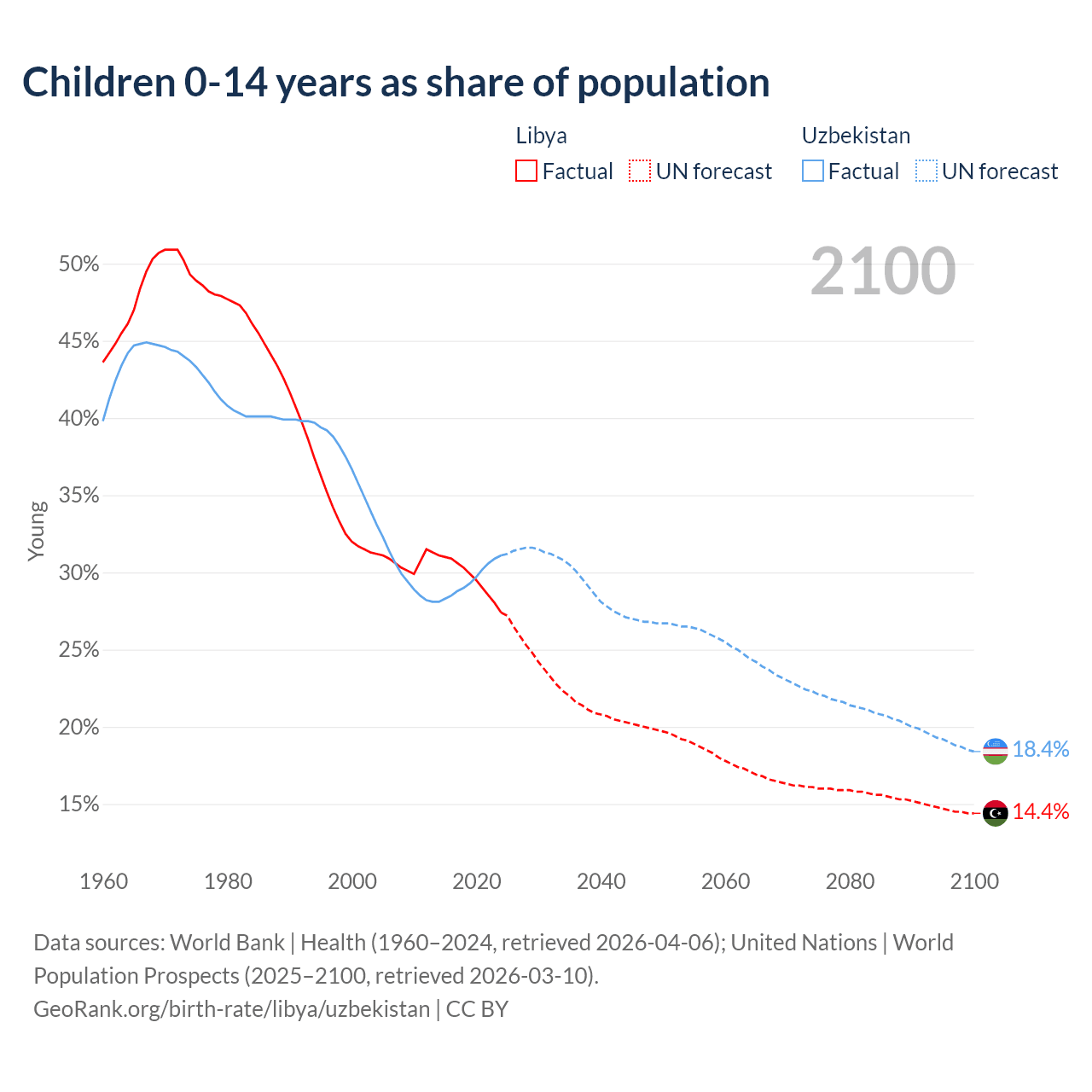 Libya has an annual birth rate of 17 births per 1,000 people, compared to 26.5 for Uzbekistan. The average number of children a woman is expected to have during her lifetime — the fertility rate, is 2.36 in Libya and 3.5 in Uzbekistan — 48.6% difference.