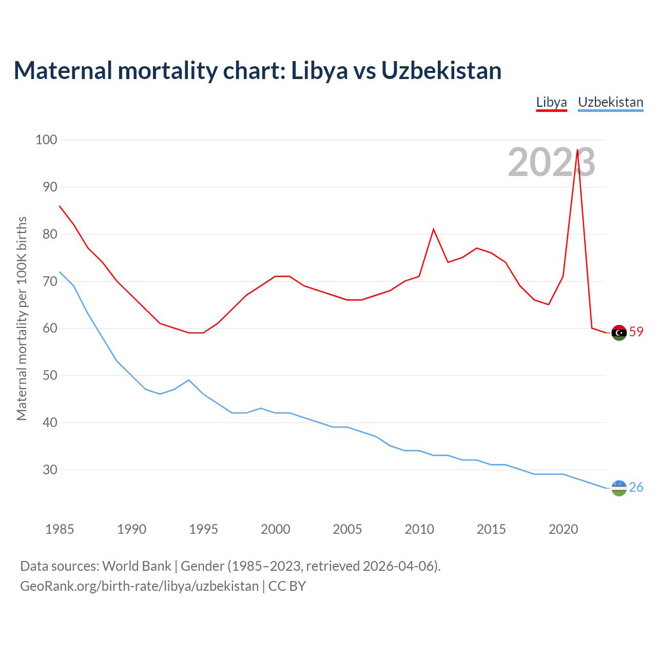 The maternal mortality rate, which is the probability of dying during childbirth or within 42 days of pregnancy termination, is 59 deaths per 100,000 live births in Libya, compared to 26 deaths in Uzbekistan.