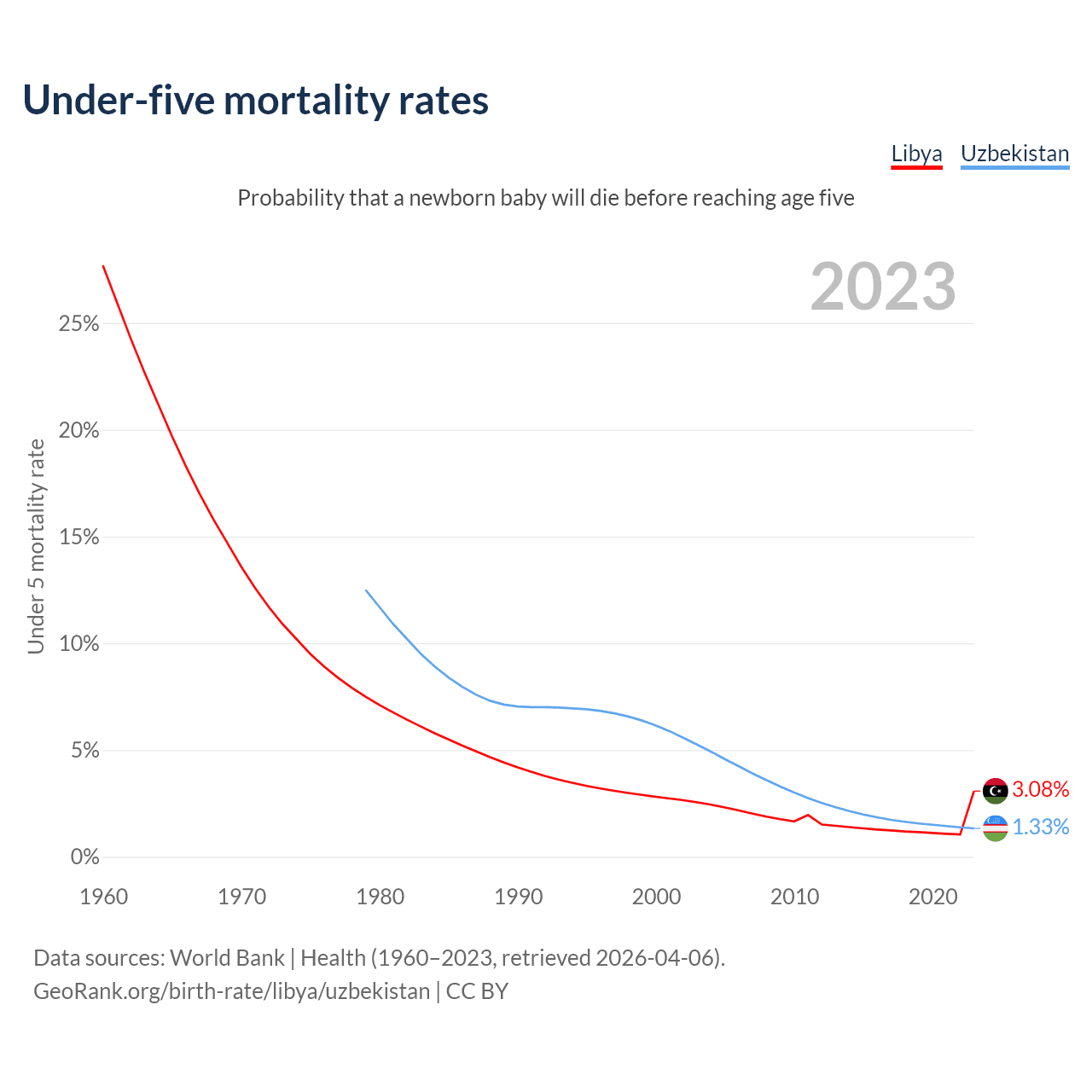 The chance that a newborn baby will die before reaching age five is 3.08% in Libya and 1.33% in Uzbekistan. Above is a chart with historical data on under-five mortality rates.